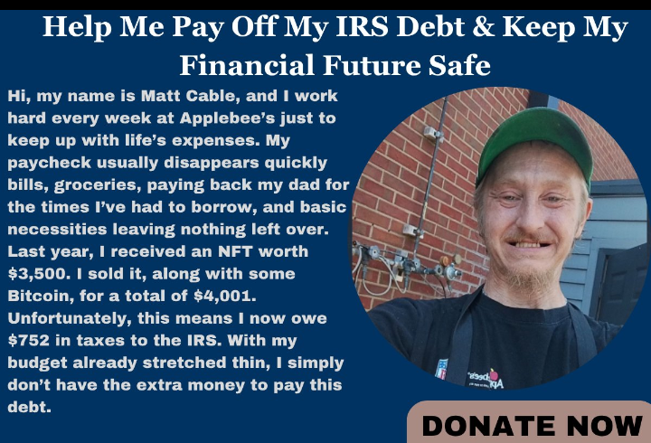 Last year, I received an NFT worth $3,500. I sold it, along with some Bitcoin, for a total of $4,001. Unfortunately, this means I now owe $752 in taxes to the IRS. With my budget already stretched thin, I simply don’t have the extra money to pay this debt.