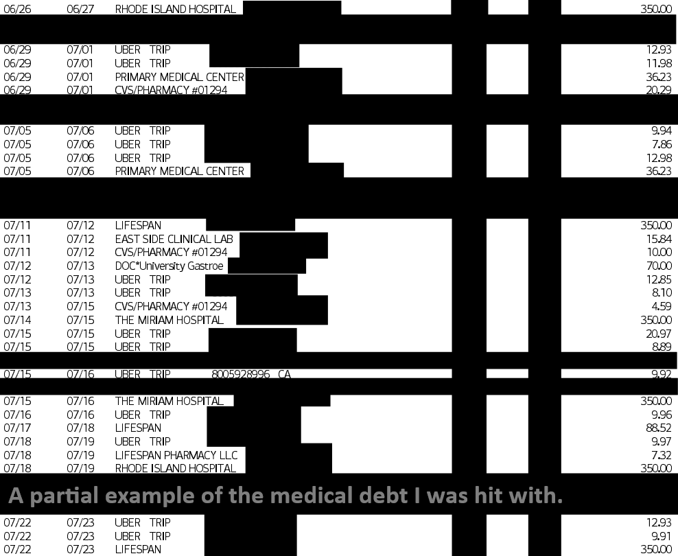 Things just sort of stayed bad from there. Over the past year and a half, I was hit with a cracked crown that needed replacing, as well as two bacterial infections that knocked me out for several weeks each, additional mysterious bouts of abdominal pain, and worst of all, lengthy periods of severe mental health issues, all of which resulted in me taking multiple extended periods of leave from work. This was unpaid leave, and I had to rely on state temporary disability insurance during those periods. The U.S. being what it is, this was nowhere near enough to cover my needs, and I rapidly ate through my savings. I have also needed to see a mental health specialist on a monthly basis, sometimes more, which my health insurance did not cover very well.
