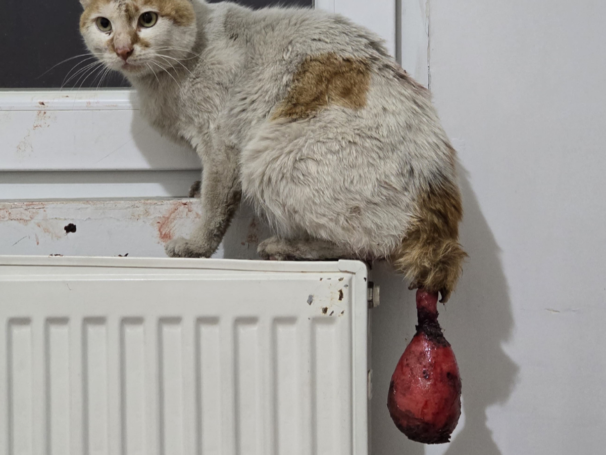 About two weeks ago, Simba was first spotted on the streets, but despite all our efforts, we were unable to catch him at the time. Days later, we were relieved to find him again and finally managed to bring him to safety. He is an extremely timid cat, still too frightened to let us approach him easily. Yet, we cannot stand by and watch him suffer.