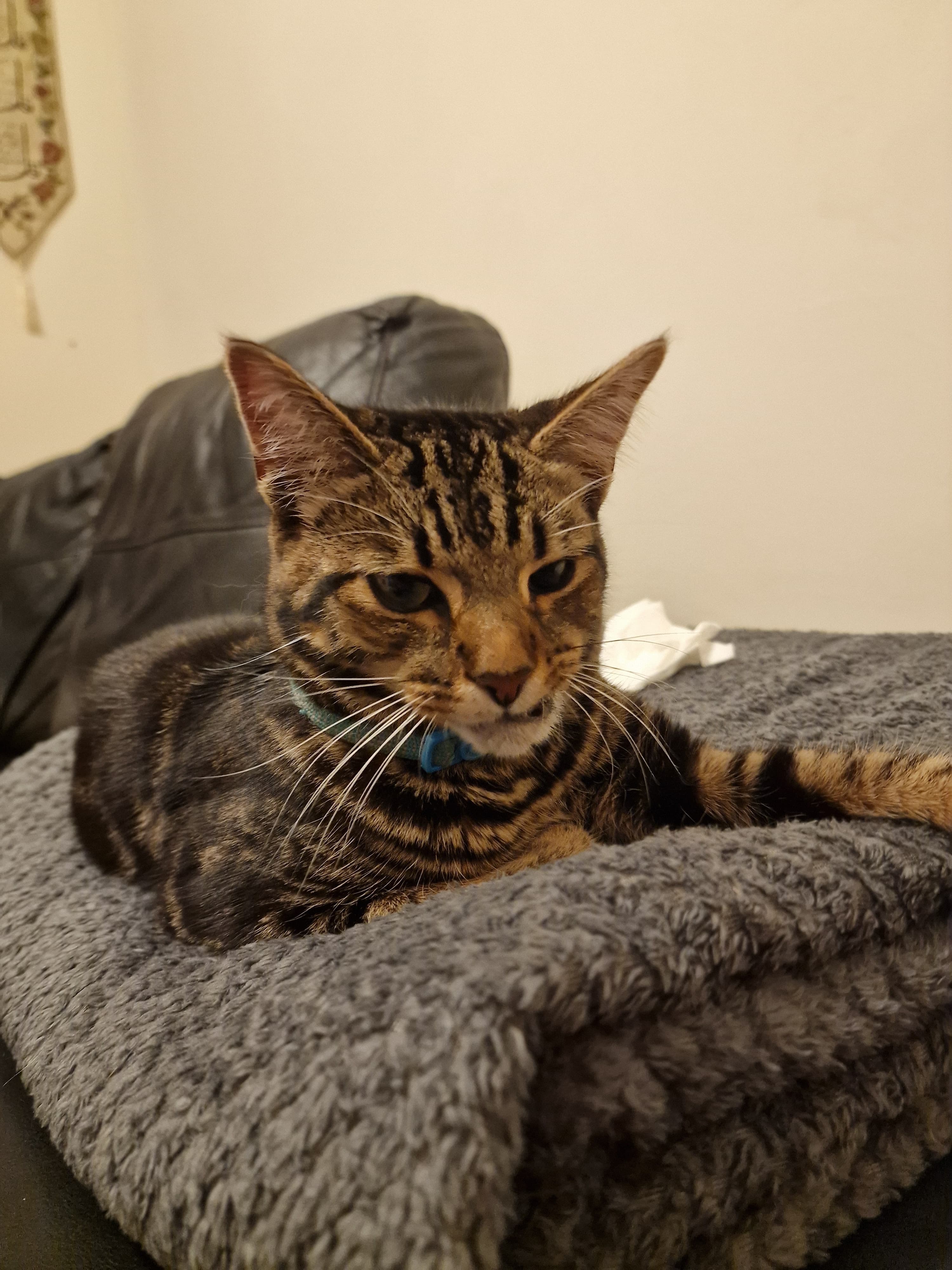 Simba is our beautiful, charming 8-month-old cat, full of personality and love. We brought him home as a tiny kitten, and he quickly became part of our family. At first, he stayed indoors, then slowly began enjoying our back garden. Eventually, we let him explore the nearby streets to get used to his surroundings and learn his way back home.