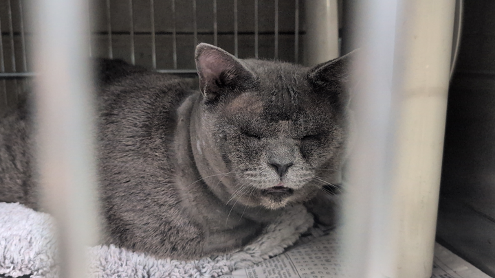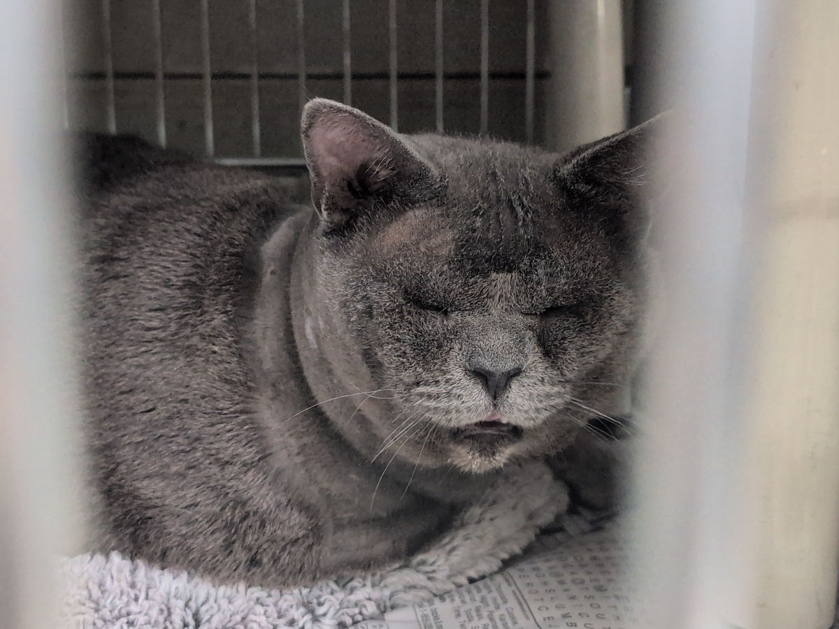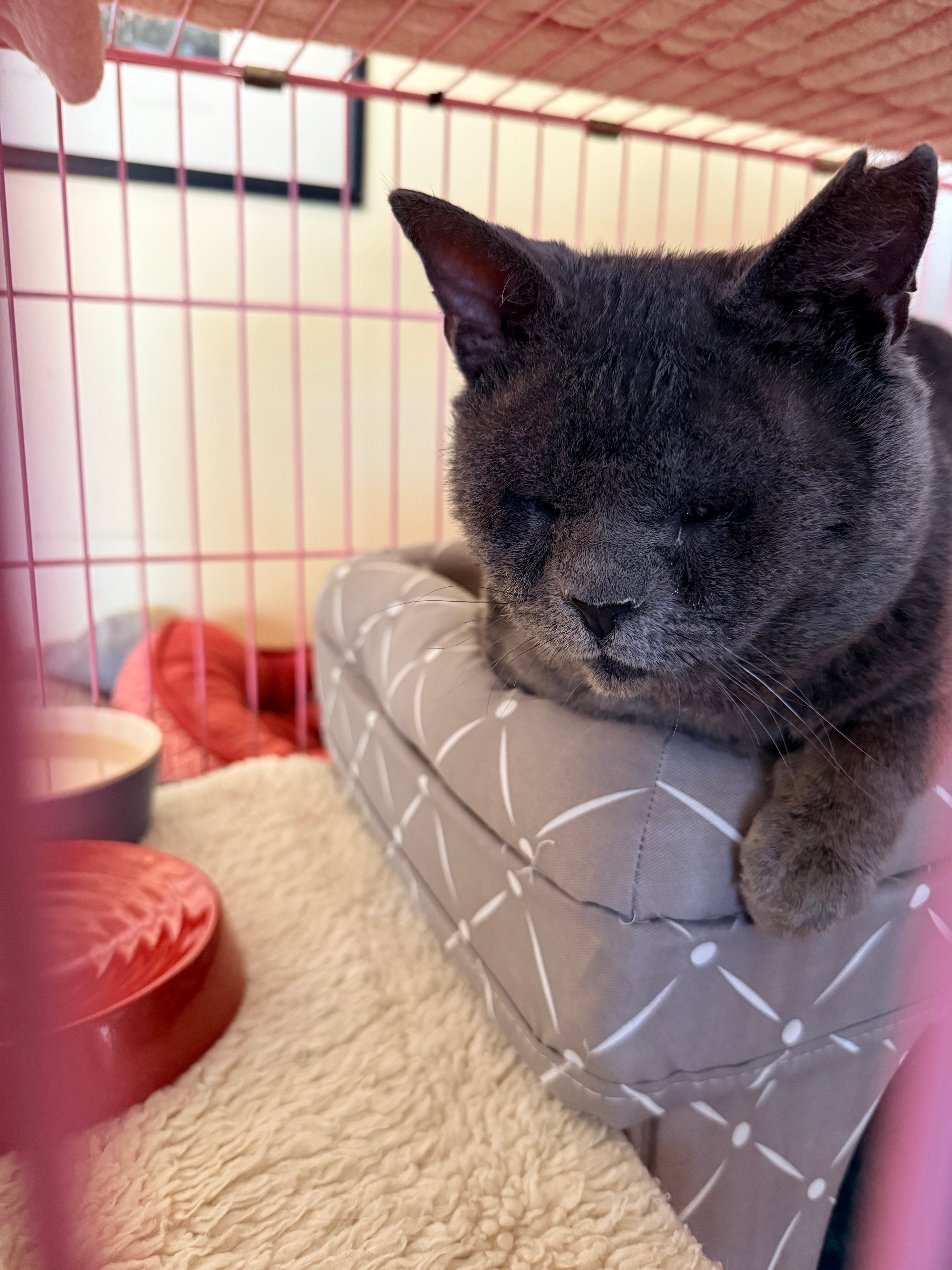 Simon suffers from entropion, a condition where the eyelid rolls inward and the fur constantly rubs against the cornea. It is extremely painful and causes ongoing irritation. He needs surgery on both eyes. Without treatment, the condition will continue to damage his eyes and could lead to permanent blindness.