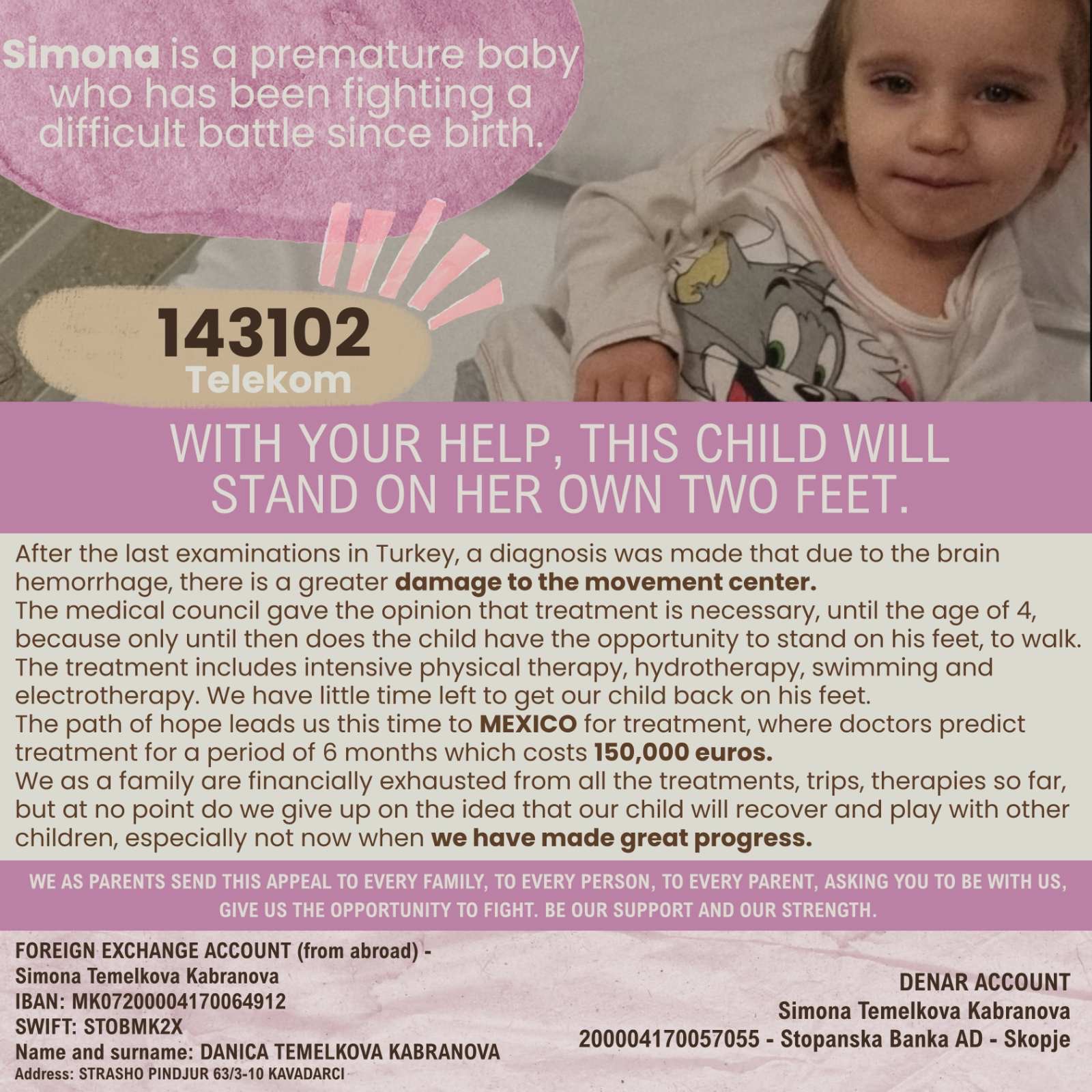 I'm Angel, a friend of little Simona's parents. After I found out about little Simona's diagnosis, which they had been waiting for for many years, I decided to help Simona get back on her feet.