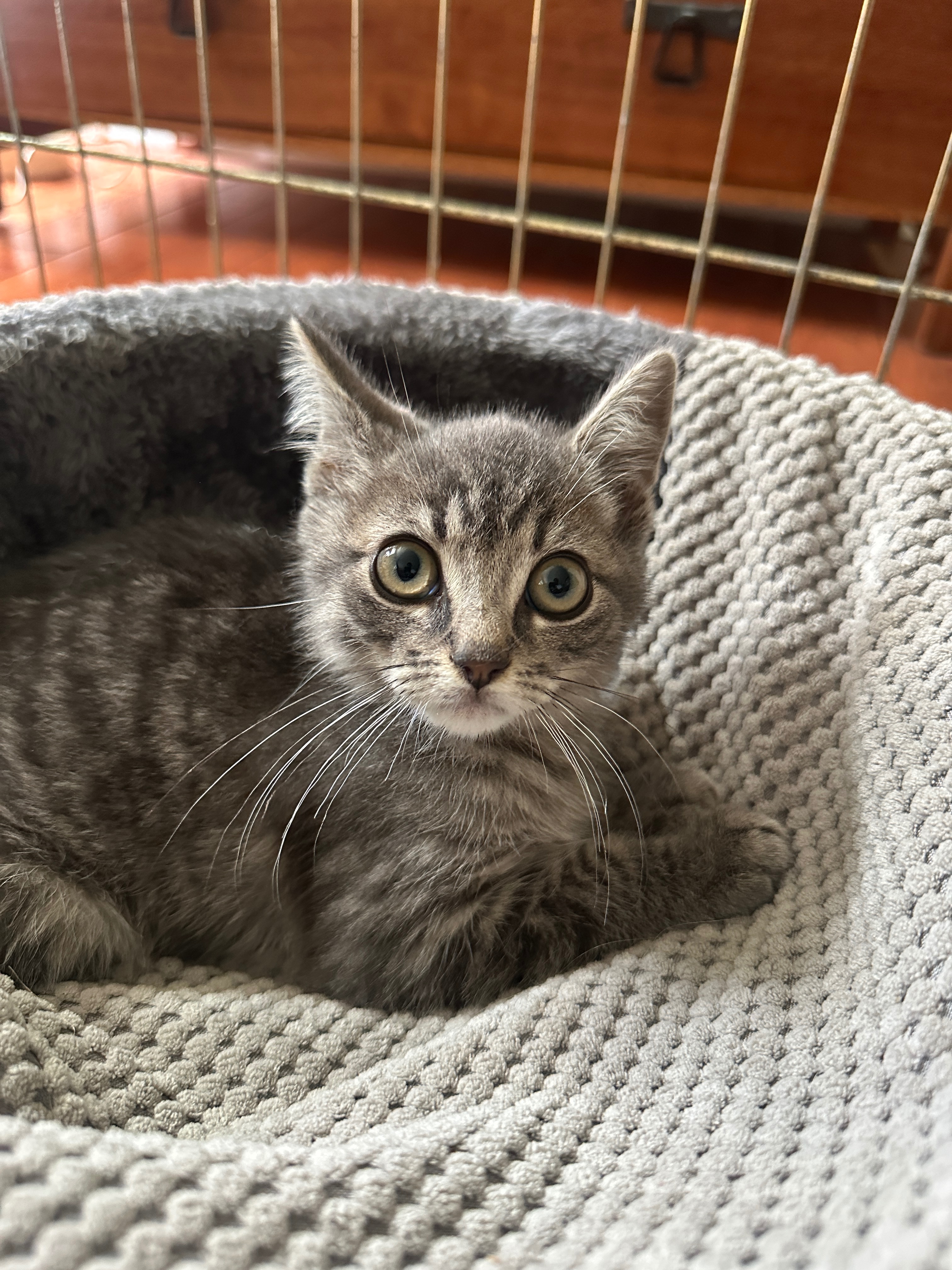 About a month ago, we found a tiny kitten on the side of the road. The kitten was crying and dragging his back legs behind him, barely able to move. We rushed to the emergency vet and they told us the kitten was about 8 weeks old and had a dislocated hip on his right side. We named him Skye, and committed to getting him everything he needs to heal.