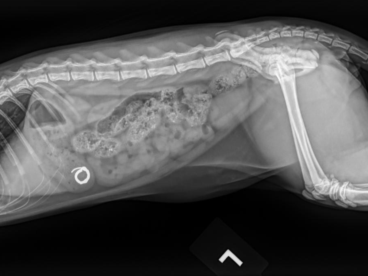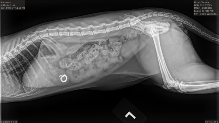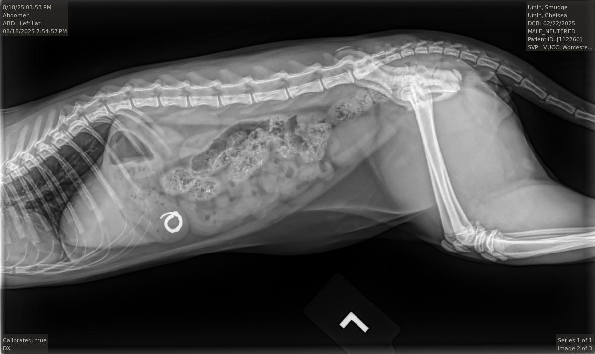 On the night of Sunday, August 17th, Smudge was cuddling with us in bed before we went to sleep. He started licking Chelsea's ear, and before she knew what had happened, he had somehow dislodged her hoop earring and swallowed it straight down his throat. After frantically checking the area around our bed and sifting through his poops the next morning, we took him to urgent care to get radiographs, and the results confirmed the worst. He had swallowed the whole earring, and it was currently resting in his stomach.