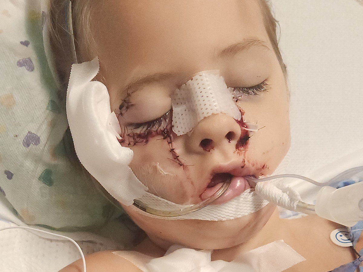 She was rushed to surgery , having a total facial reconstruction procedure, including full nose reconstruction and stitches to her throat, groin and thigh area and buttocks.