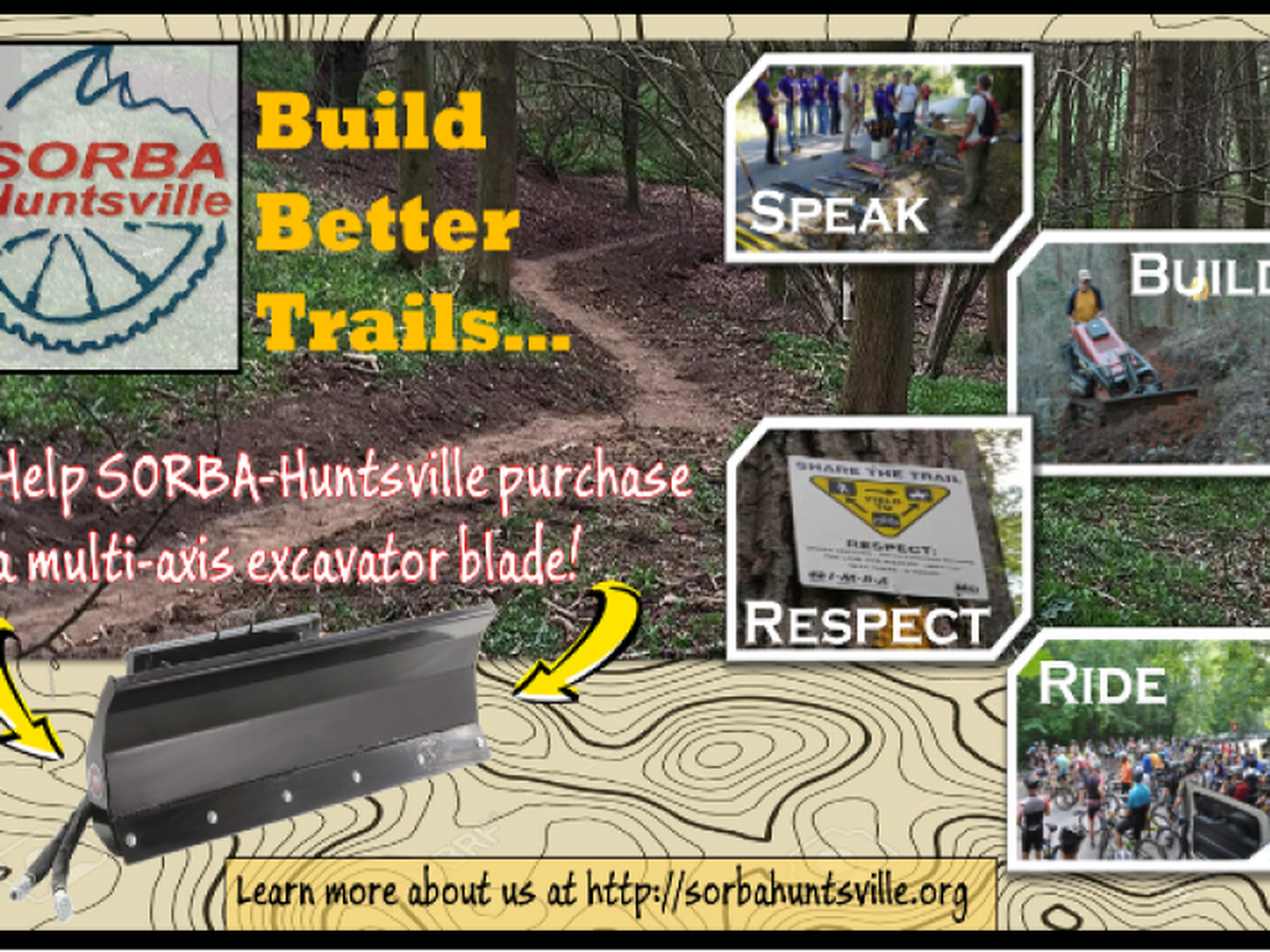 Calling all North Alabama mountain bikers, trail runners, hikers, dog walkers and outdoor enthusiasts! Do you enjoy our beautiful local trails? Would you like more of them? The Huntsville Chapter of the Southern Off-Road Bicycling Association (SORBA Huntsville http://sorbahuntsville.org/ ) is asking for your help in raising funds to purchase a 6-way excavator blade that our volunteers can use to build and maintain a variety of current and future trail-work projects.