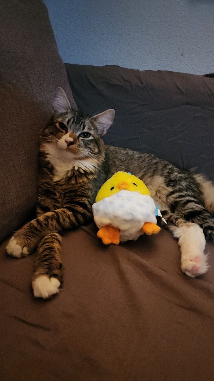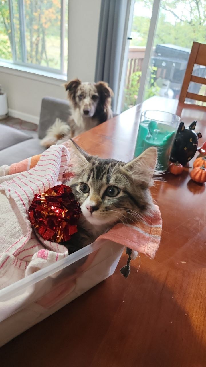 A little backstory of Spidey. We adopted him from Furry Friends as a birthday gift to our 5-year-old son. We are now a family of 6. My wife and I have a 7-year-old daughter, a 5-year-old son, and a 2-year-old Aussie named Kiwi that we got as a birthday gift for our daughter. Spidey the cat has been one of the best cats we have ever seen. He has never taken his claws out on any of us and plays daily with our dog. He sleeps with the kids and likes to play with Kiwi the Aussie dog during the day.