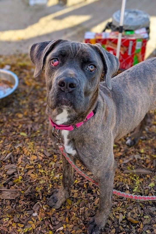 Unfortunately, Starburst has cherry eye in one eye. Cherry eye is a condition where the third eyelid becomes swollen and protrudes. While it’s often considered cosmetic, it can become uncomfortable and more complicated the longer it goes untreated. Because of limited resources, this is not a procedure the county shelter is able to cover — and sadly, it’s often enough to cause potential adopters to pass her by.