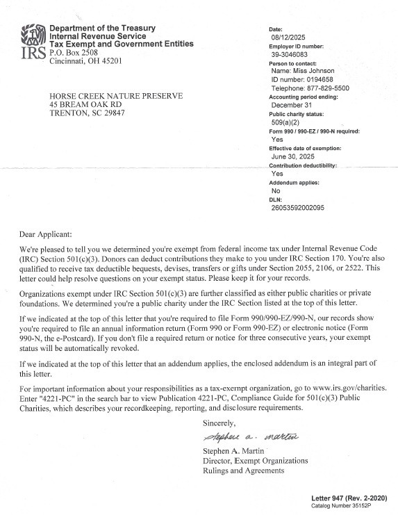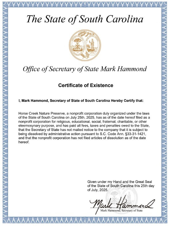 We believe this land should be protected forever. That’s why Horse Creek Nature Preserve, a South Carolina nonprofit and IRS-recognized 501(c)(3), is working to:
