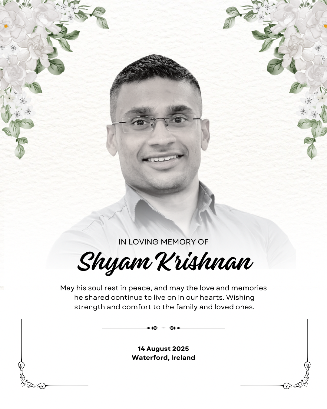 We are heartbroken to share that our dear friend Shyam Krishnan (37) passed away in Waterford after a long illness. Shyam was a kind, gentle, and loving person who touched the lives of everyone who met him. He was a devoted husband to Vaishna and a proud father to their two young children — Ethan Krishnan (3) and Enya Krishnan (1).