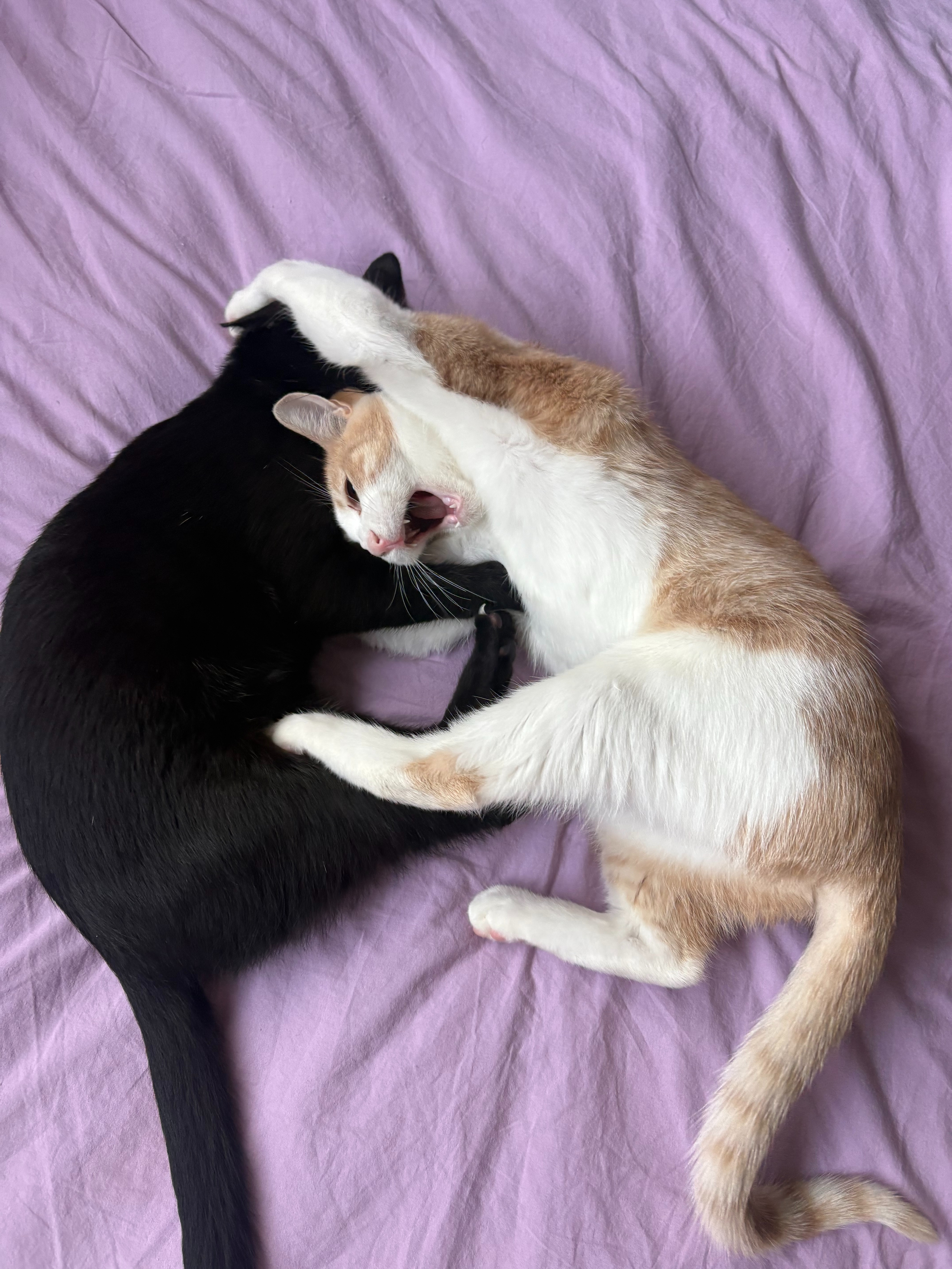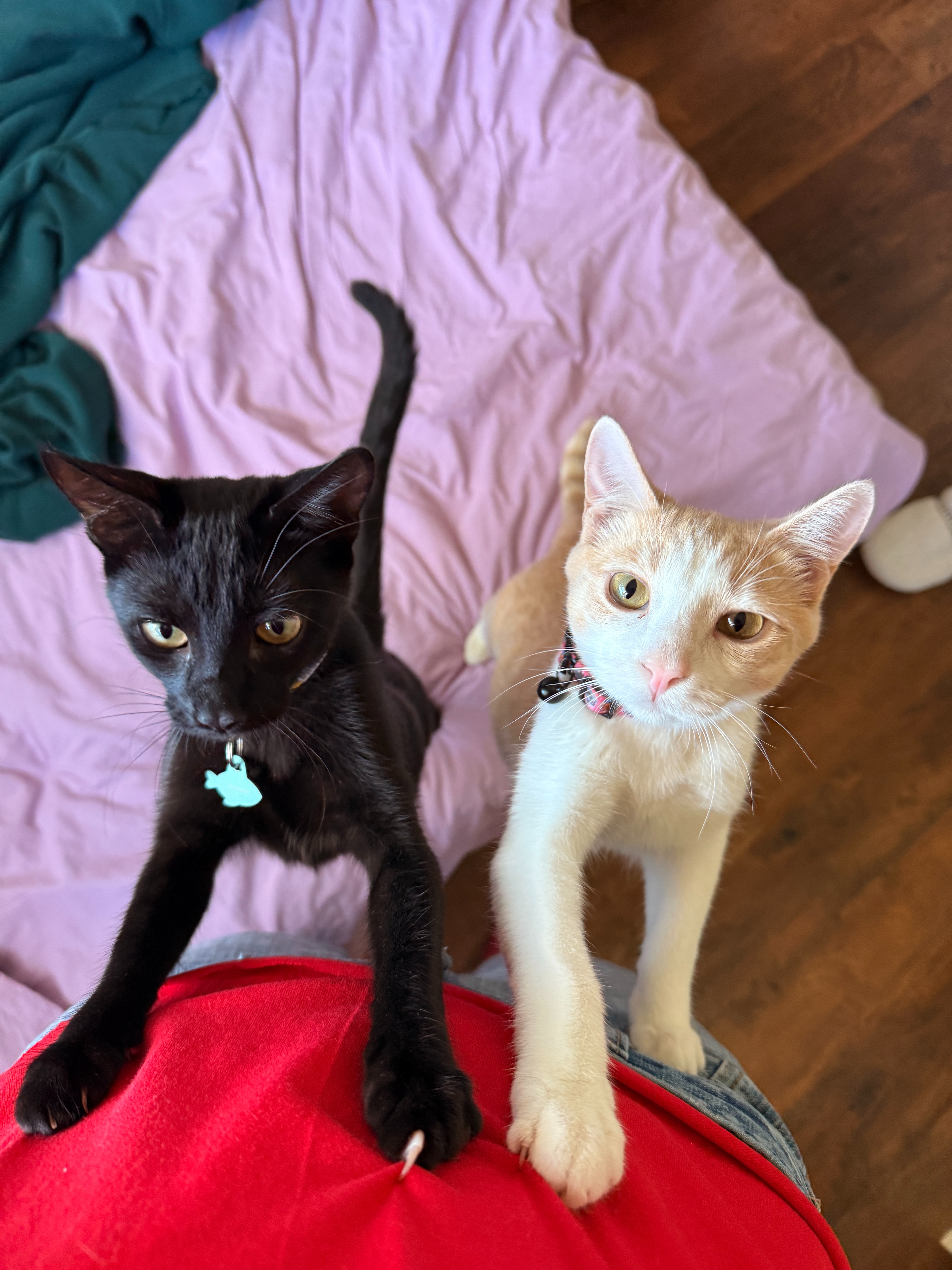 And for anyone who has not had the opportunity to meet our sweet girl, she is the kindest, softest kitty ever, who is friendly to all! Clementine enjoys sun-bathing, cuddling with her moms, and of course playing nonstop with her chosen sister(black kitty pictured) Chamomile⬛