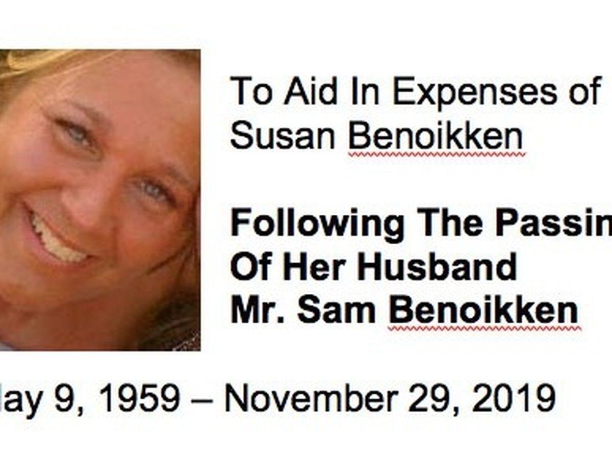 Our good friend Susan Swarner Benoikken's husband, Mr. Sam Benoikken, passed unexpectedly on Friday, November 29, 2019. Sam had been Susan's sole source of income as she is suffering from fibromyalgia and trying to get her health back so she can return to the workforce. Please help Susan over this financial hump so she can pay her bills over the next few months until she sorts out finances, and how she can move forward.