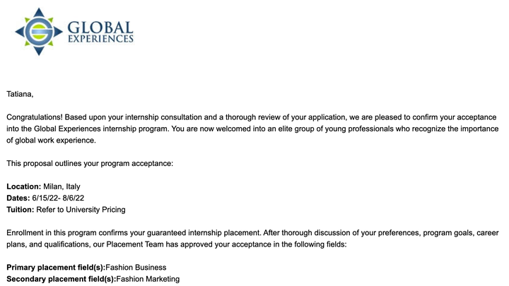 What: I’m honored to have been accepted into a skills-based Fashion and Design Internship study abroad program this summer in Milan, Italy(June 15-August 6, 2022)!!! I’m excited to explore the business development side of Fashion Business/Marketing and gain hands-on experience. My internship will consist of marketing on social media platforms, partaking in website development projects, research trends, business implementation plans with managers, and much more.
