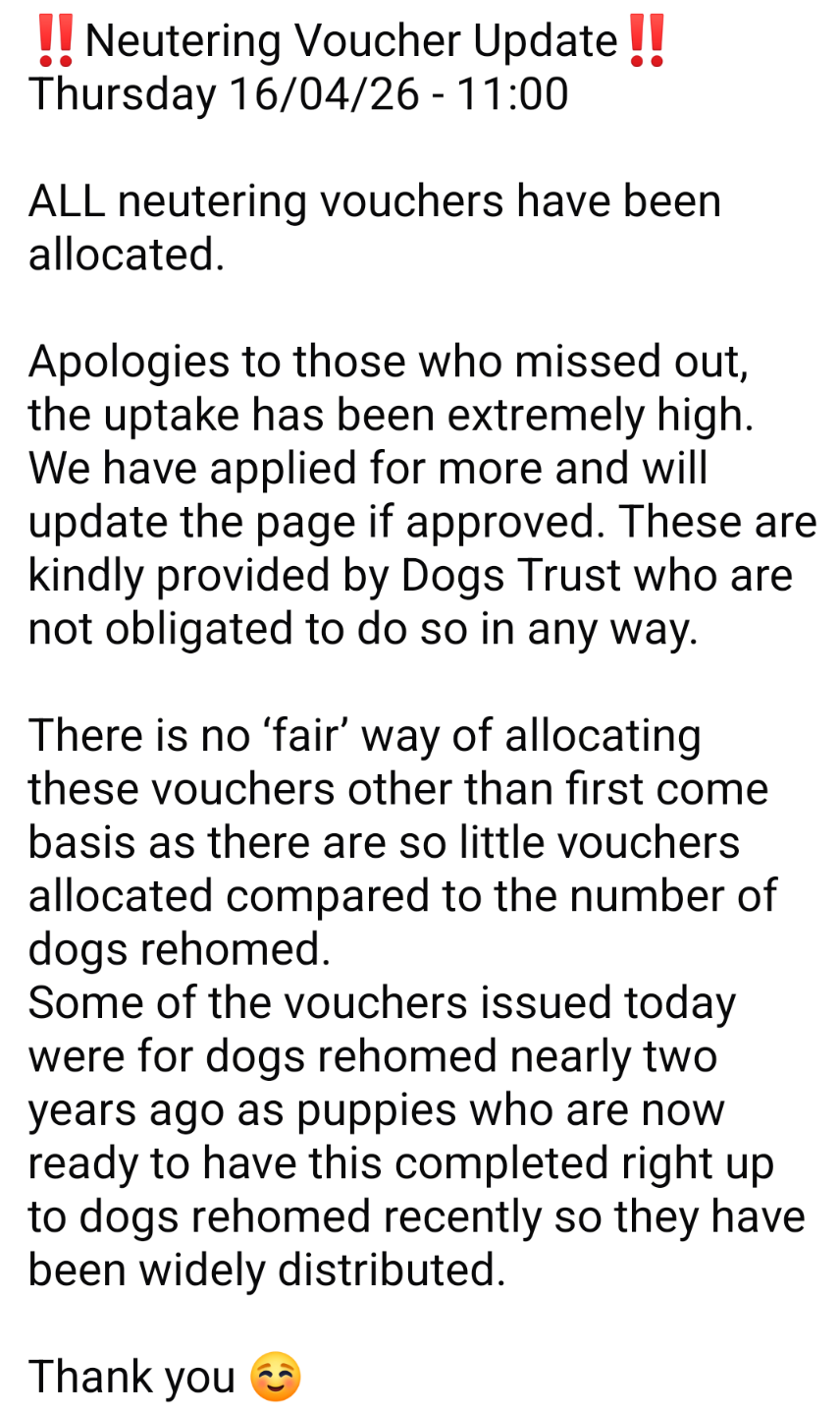 We’ve been doing everything we can to give Ted the healthy, happy life he deserves. I had been waiting on support from Dogs Trust to help with the cost of neutering, but unfortunately all of the vouchers have now been allocated.