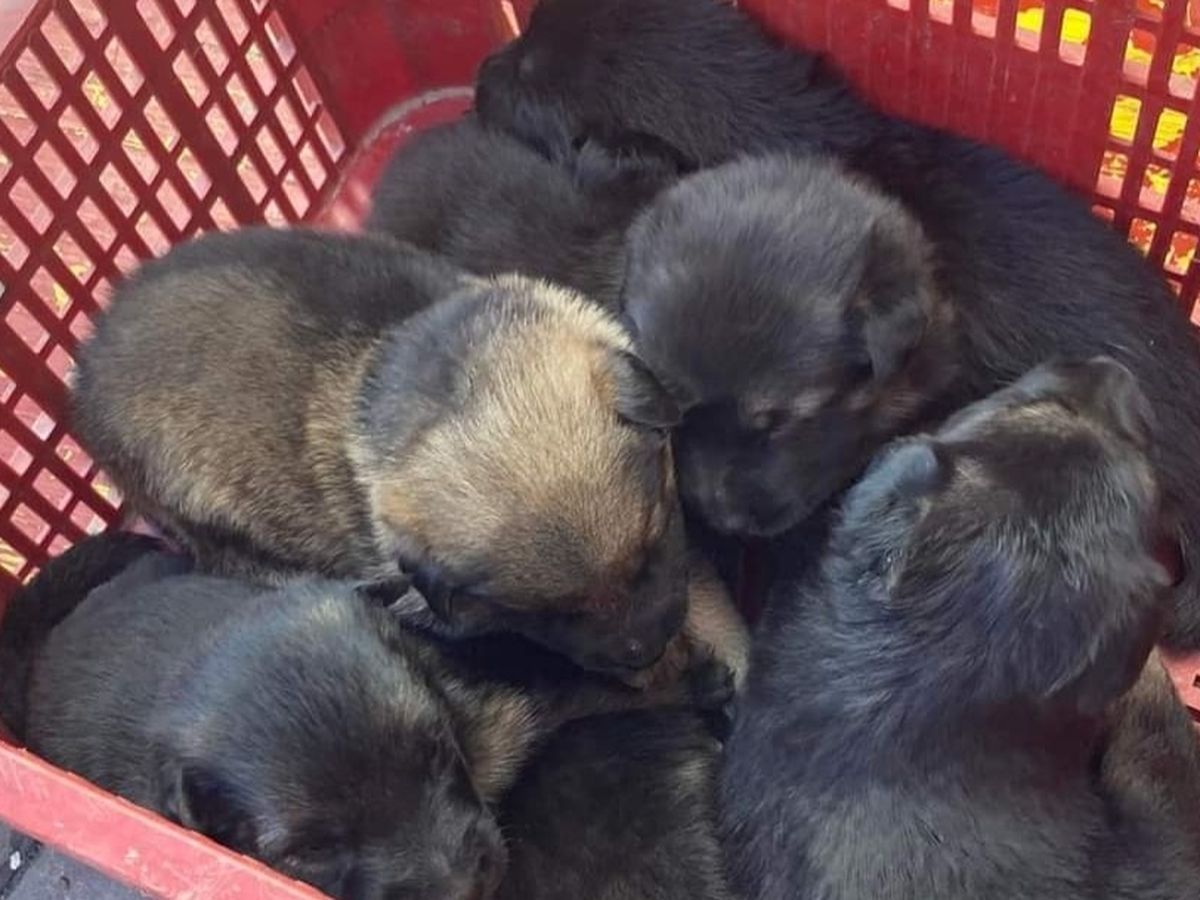 This morning a litter of 6 very young pups were discovered in a plastic crate by a street dumpster(bin).