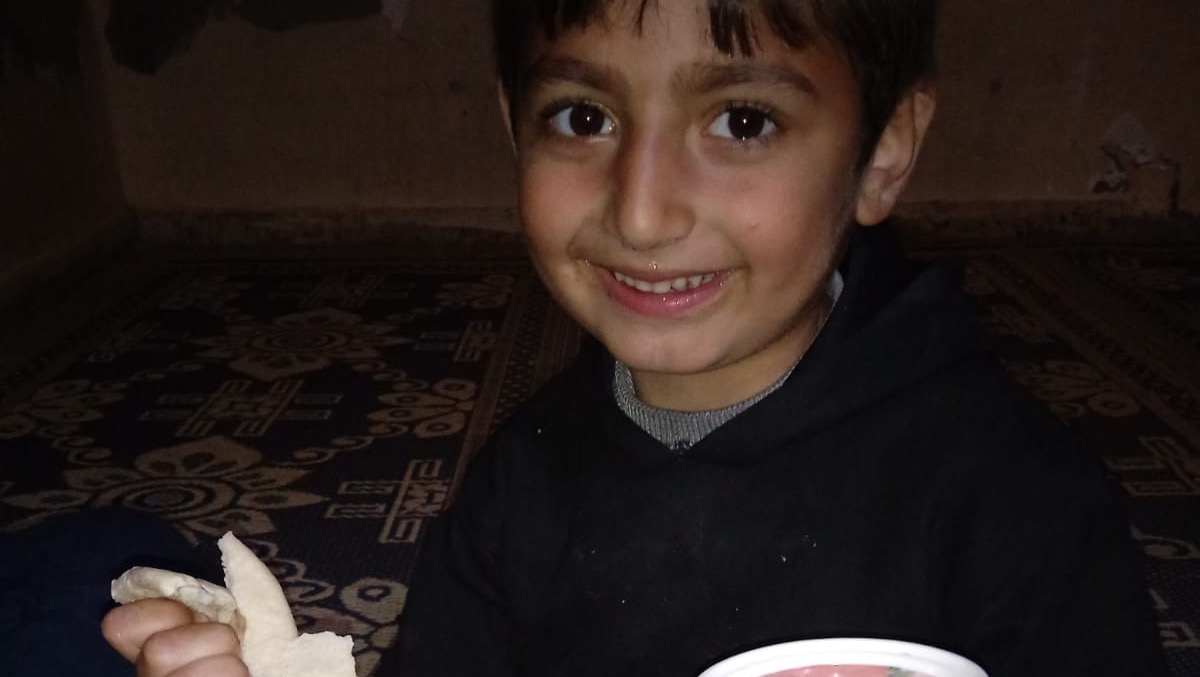 Ziad so happy to eat bread after donations were able to buy the family dinner.