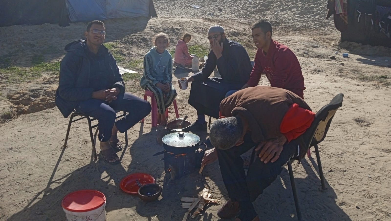 Ahmed (left) and Ward (far back) outside their tent in Rafah