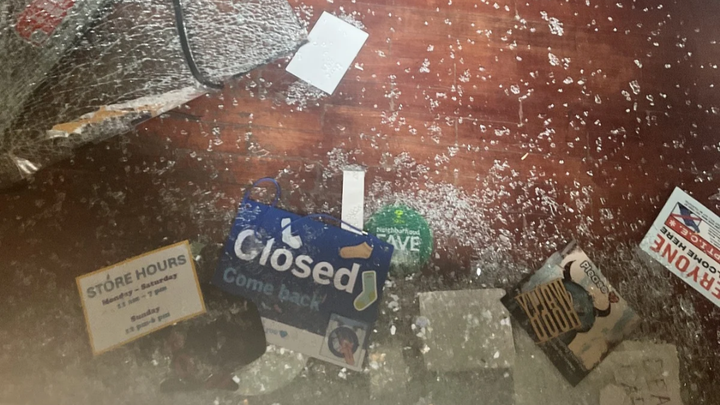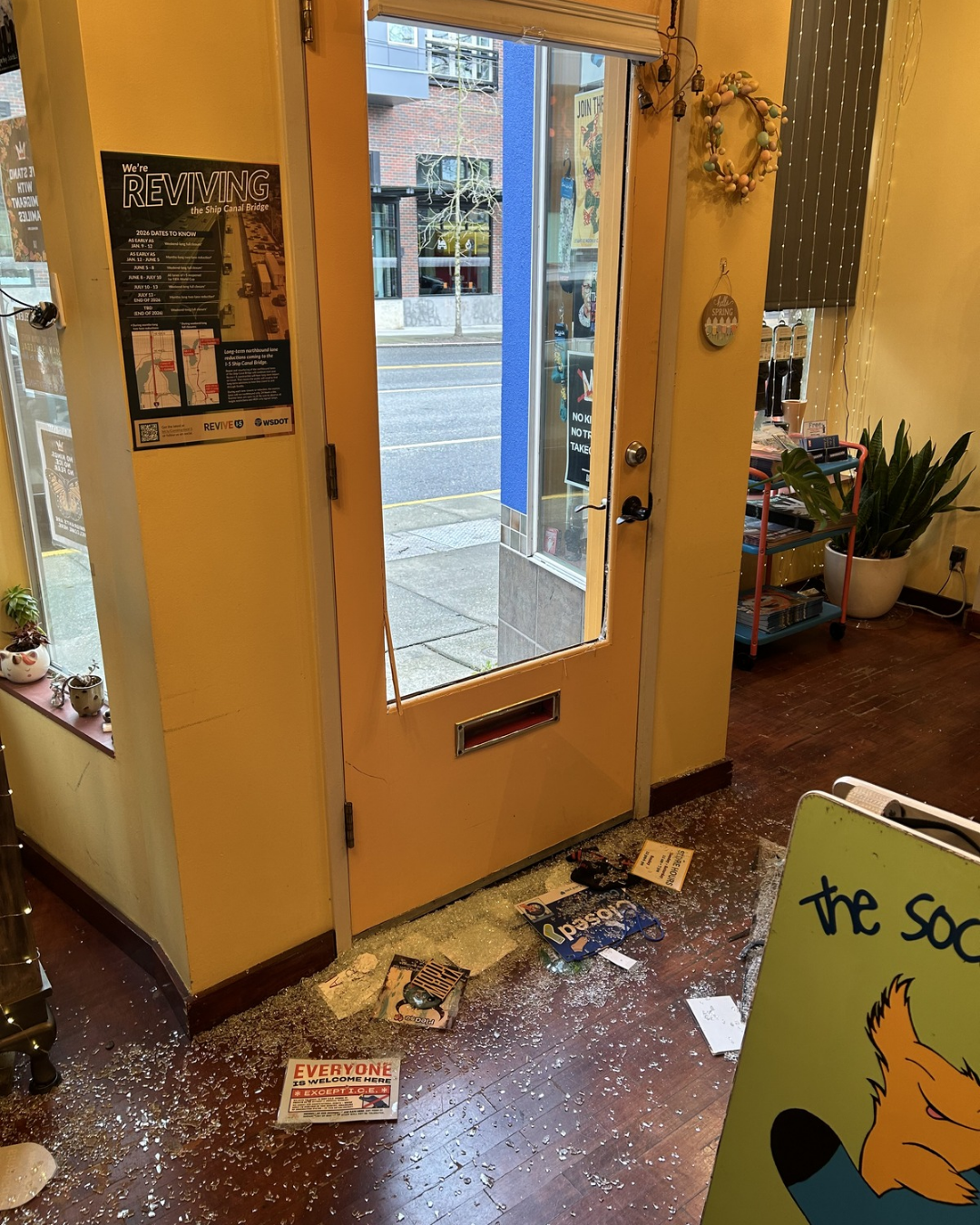 The thief broke the window on our door and stole our shop computers, cash, and some high value merchandise. We are grateful that she did not steal more products but are still devastated by the losses we have incurred.
