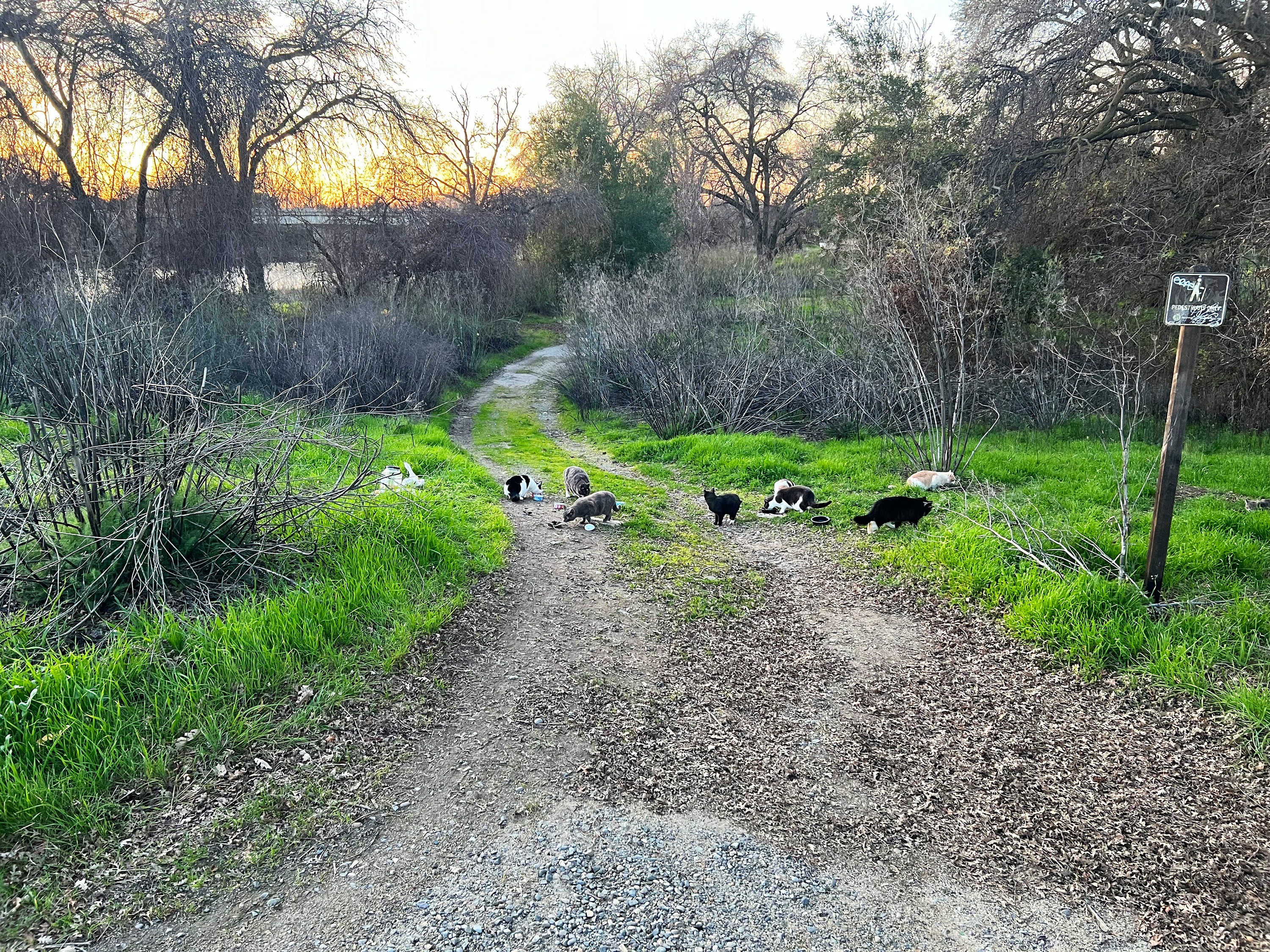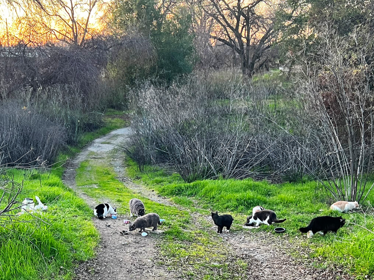 I deliver food and water to feral/wild cats that live near the American River. There are many colonies of cats that I visit, with more than 20 cats combined. I visit and feed them every day, rain or shine, and get assistance from other colony caretakers to cover my shifts if I leave town or am not available.