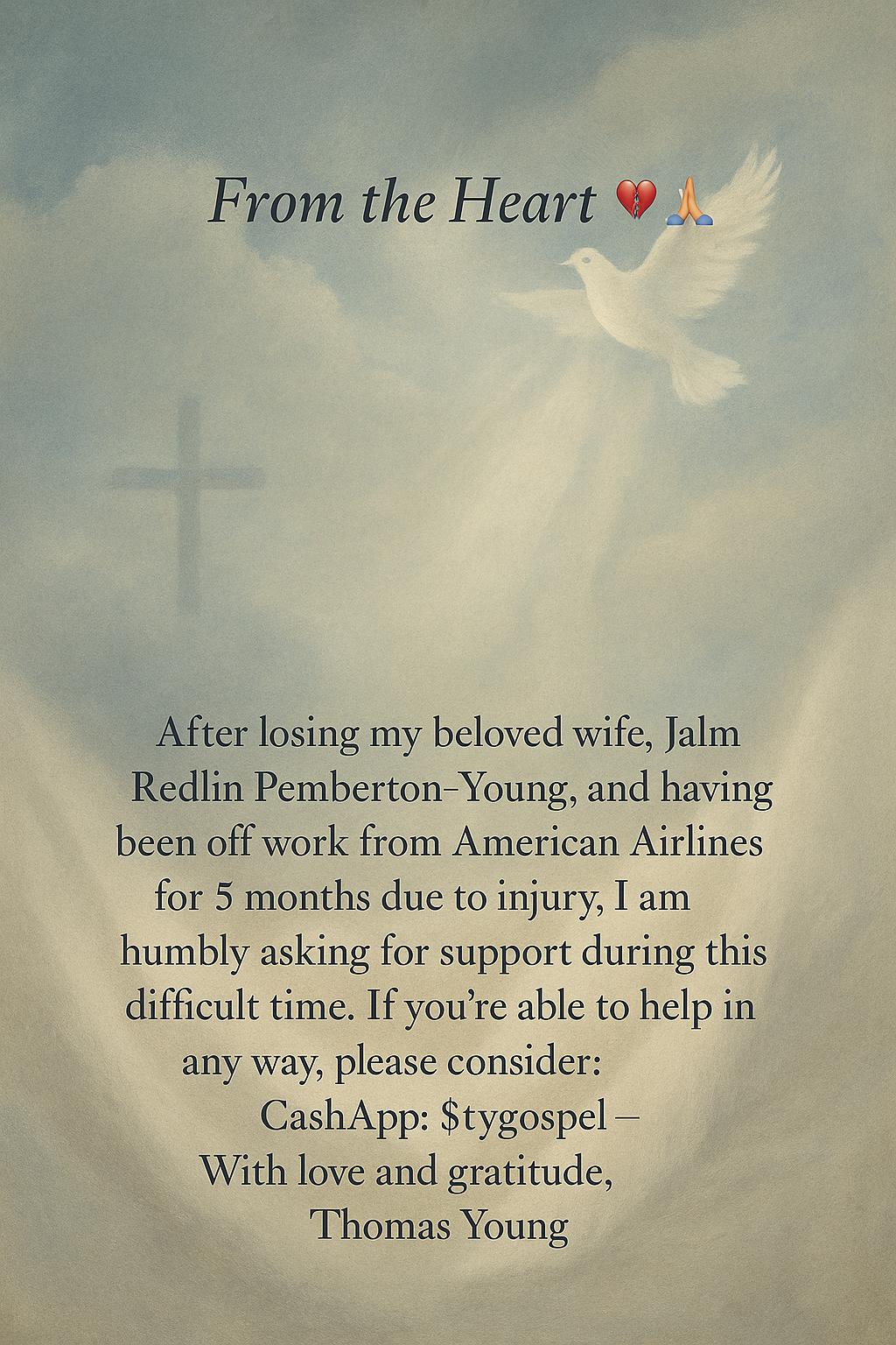 On June 11th, 2025, I lost my beloved wife, Jalm Redlin Pemberton-Young. Her passing left an enormous void in my heart and in the lives of everyone she touched. At the same time, I’ve been off work from American Airlines for the past five months due to a serious injury. This combination of grief, emotional strain, and financial hardship has brought me to a place I never expected to be.