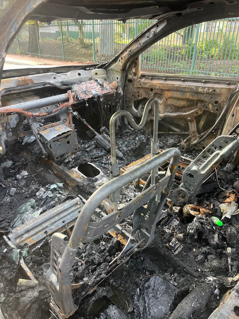 When I walked outside to my car, I saw, in horror, that my car had been completely burned to a crisp, to rubble.