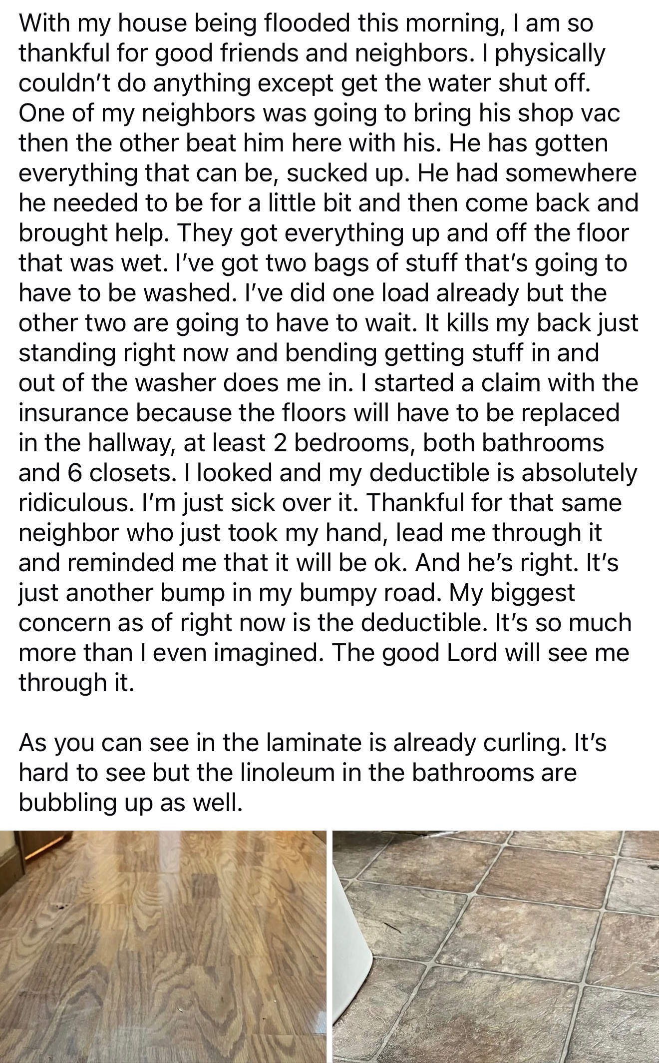 Recently, Tim’s house was flooded, leaving him without proper flooring, damaged drywall, and plumbing issues. He can’t even set up his bed right now, so he’s been sleeping in his recliner for weeks. With his back issues and neuropathy, this has created even more physical problems—just walking from his recliner to the kitchen has become a struggle. Insurance will pay for some of the repairs, but not all, and the deductibles are high. It boils down to Tim needing a little help from us.