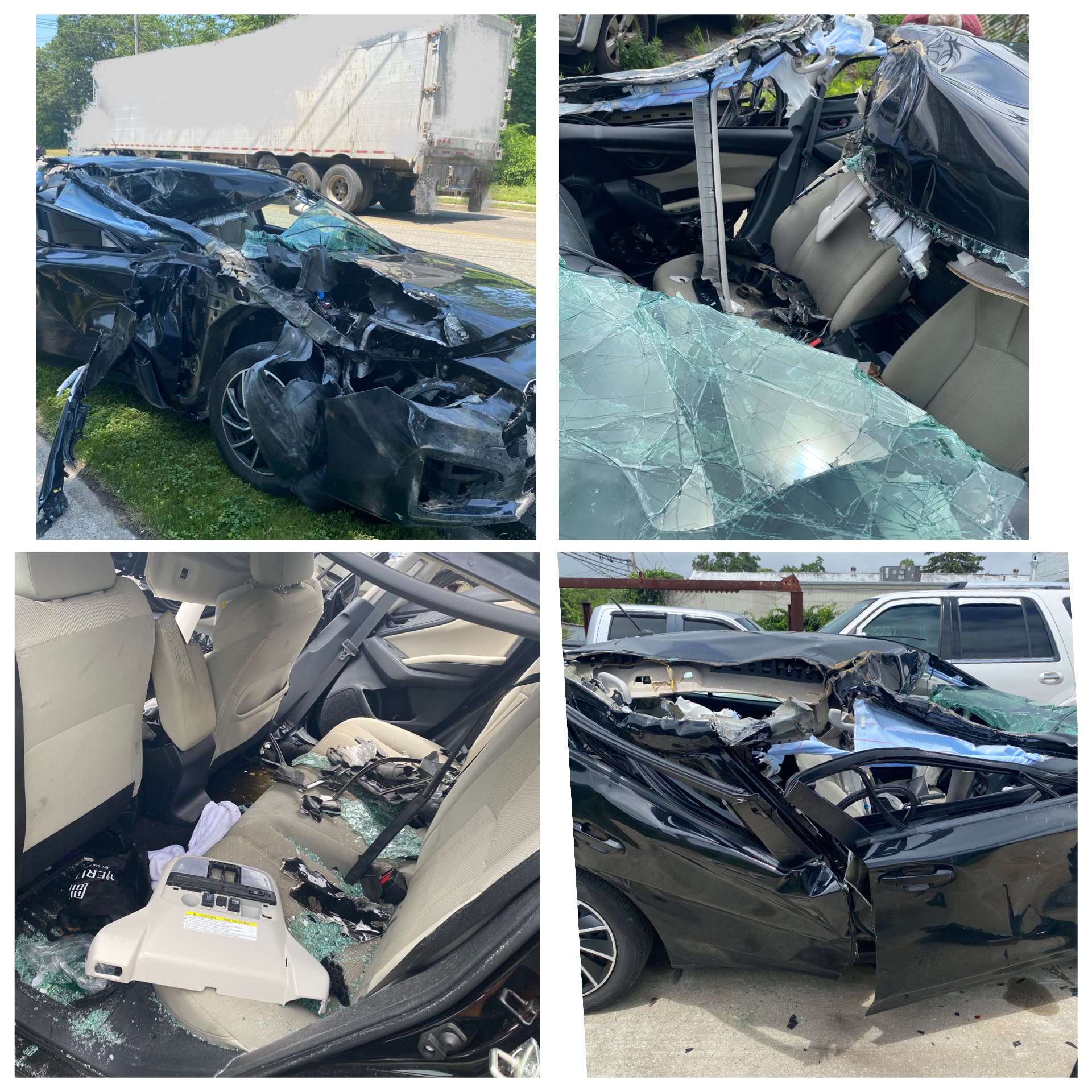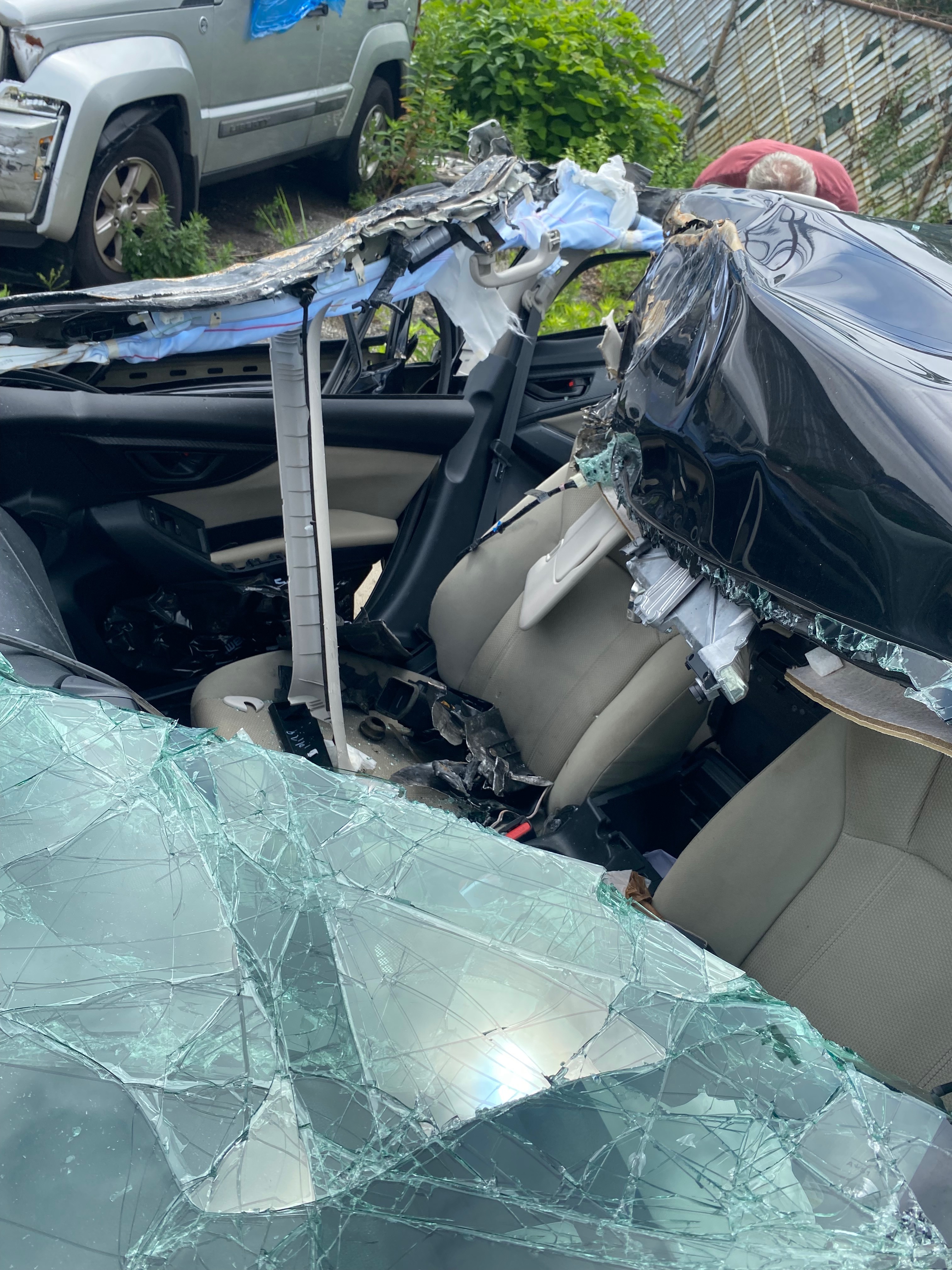 The roof crumpled over me turning car into a convertible and a sharp triangular metal less than an inch away from my head. windows front, back and sides shattered causing glass imbedded all over me including my face and head.