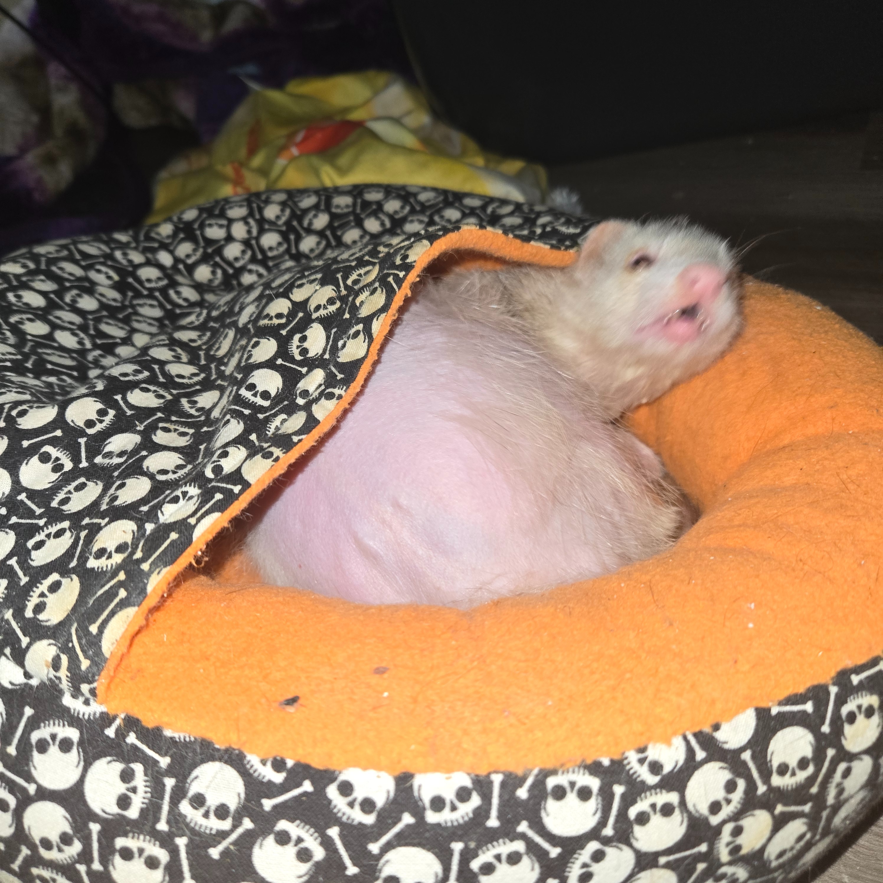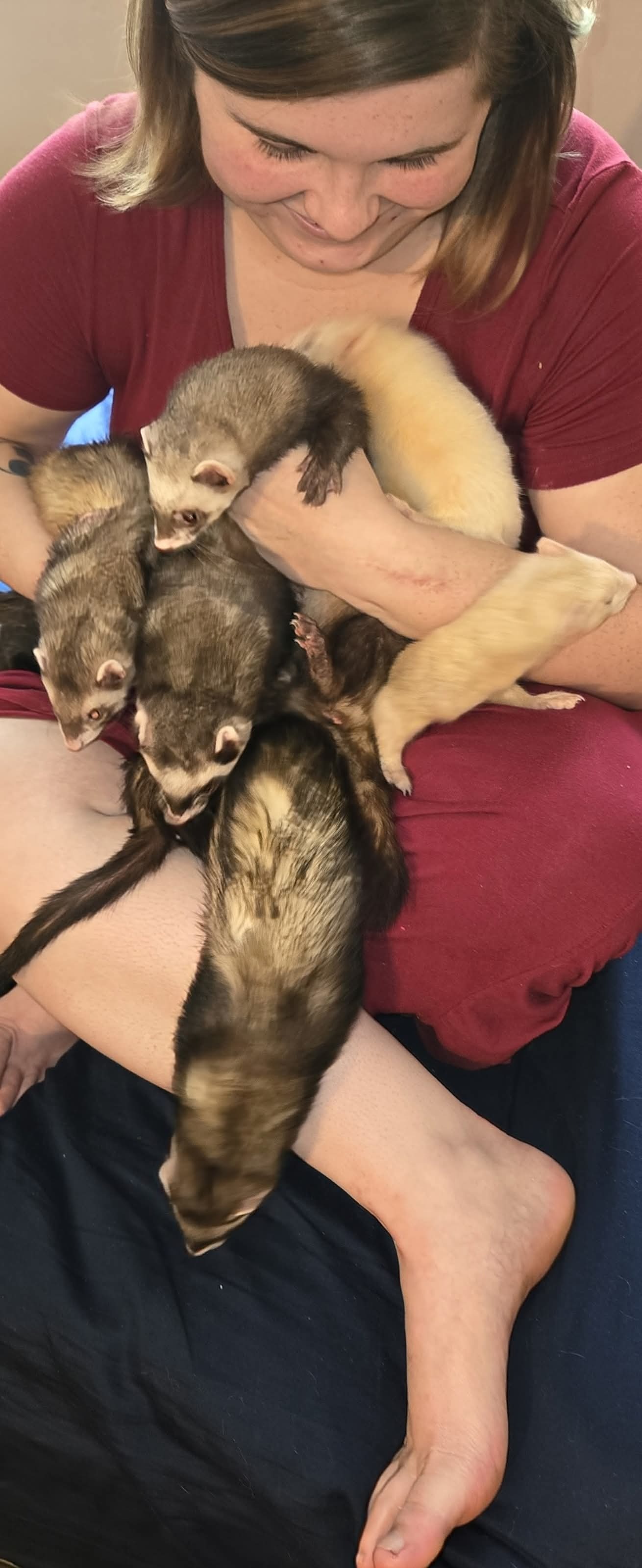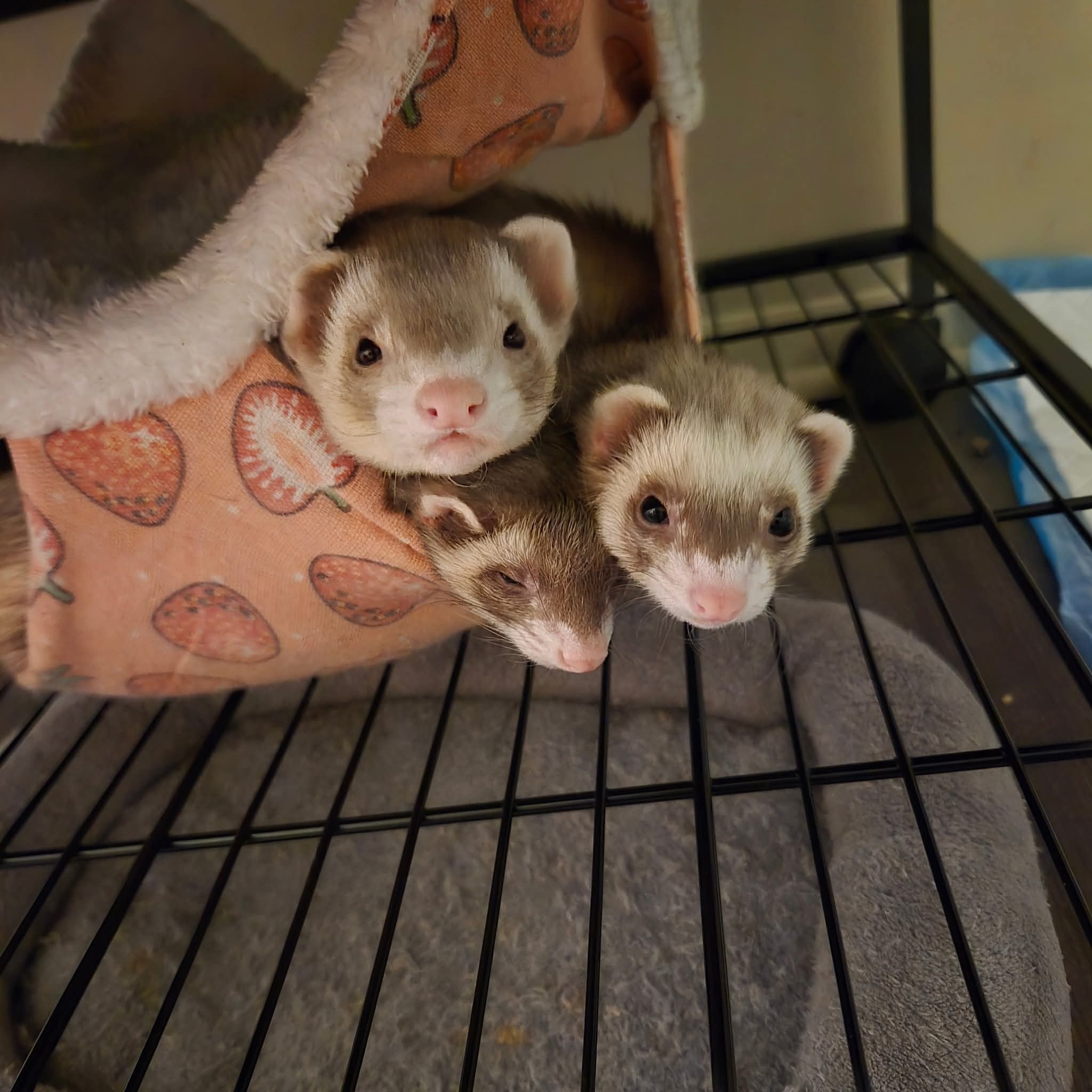 Over time, our setup got better. Our knowledge grew. We researched endlessly and talked to other ferret owners to learn as much as we could. We upgraded everything piece by piece. All of our ferrets were transitioned onto a raw diet, and we began seeing firsthand how much healthier and happier they were. We invested in multiple Ferret Nation cages and combined them into one large connected space, so they had a clean and safe place to sleep every night. Our living room became theirs, full of tubes, tunnels, toys, hammocks, and baskets of treats. We worked hard to make sure every single ferret had the enrichment and attention they deserved. It wasn’t just a rescue. It was their home, and we made sure it felt like one.