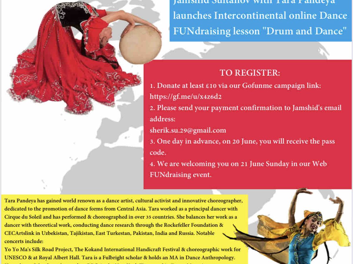 This FUNdraising “Drum and Dance” class for charity organized by London-based Jamshid Sultanov, will be led by dance artist Tara Pandeya from San Francisco and drum-player Aslimkhoja joining us from Tashkent. Participants will be introduced to basic drum playing techniques and drum recitation made for dance and syncopated “harikat” (movements) which mirror the drum.