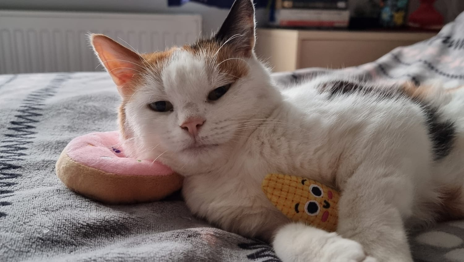 And a more recent one of her with her new catnip-filled corn and doughnut toys: