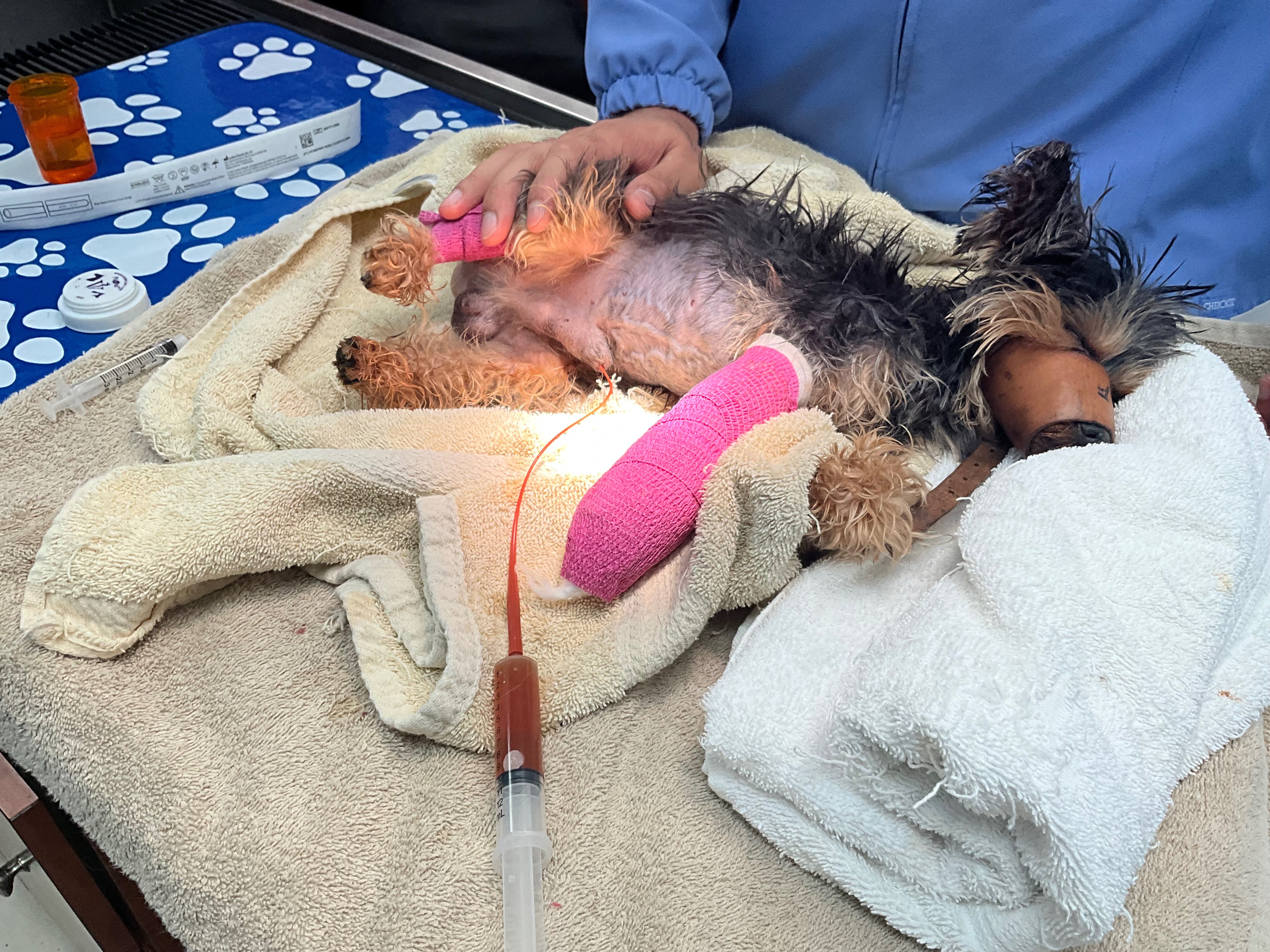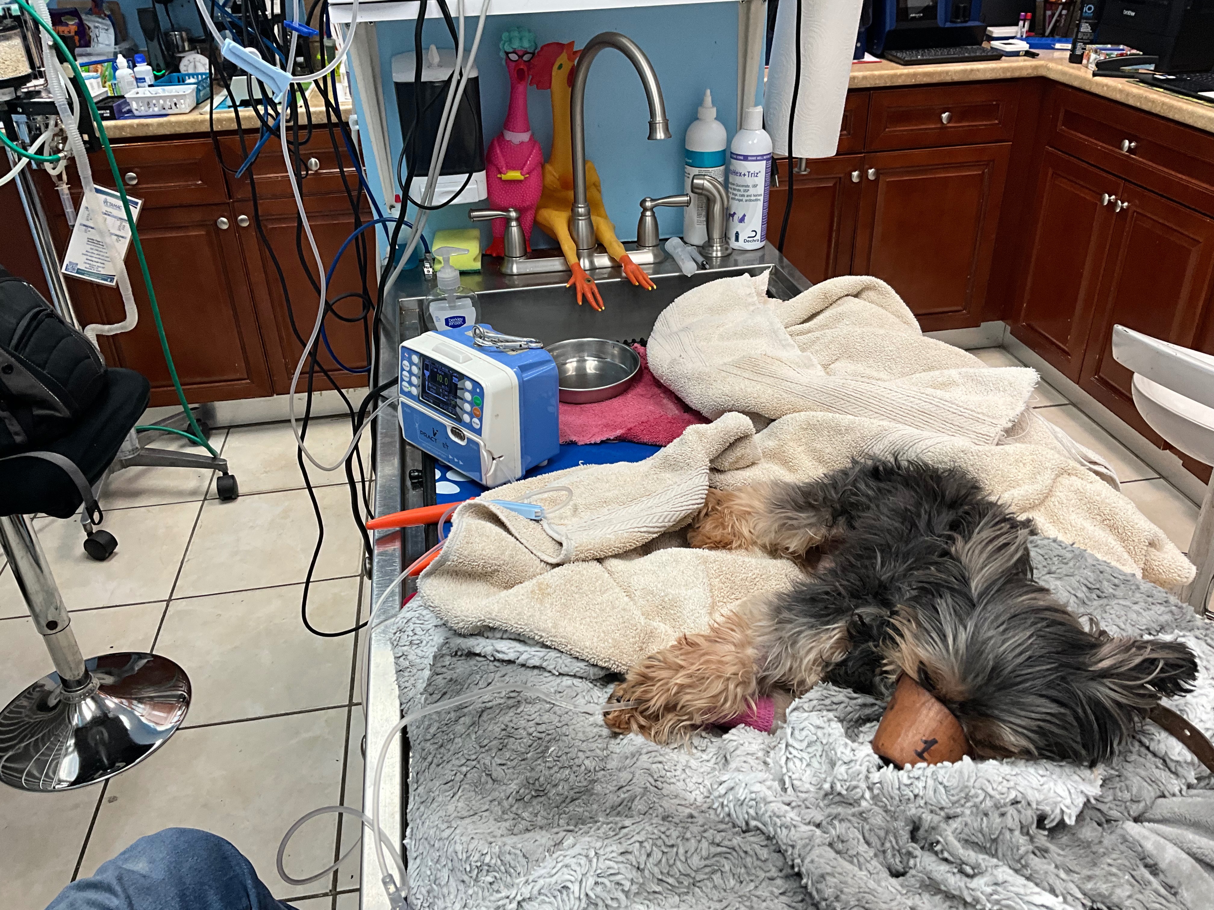 Toby has been receiving treatments and procedures, including iv catheter, a urinary catheter, liquid supplements, and medicine via oral tablets and anti-bacterial/other injections.