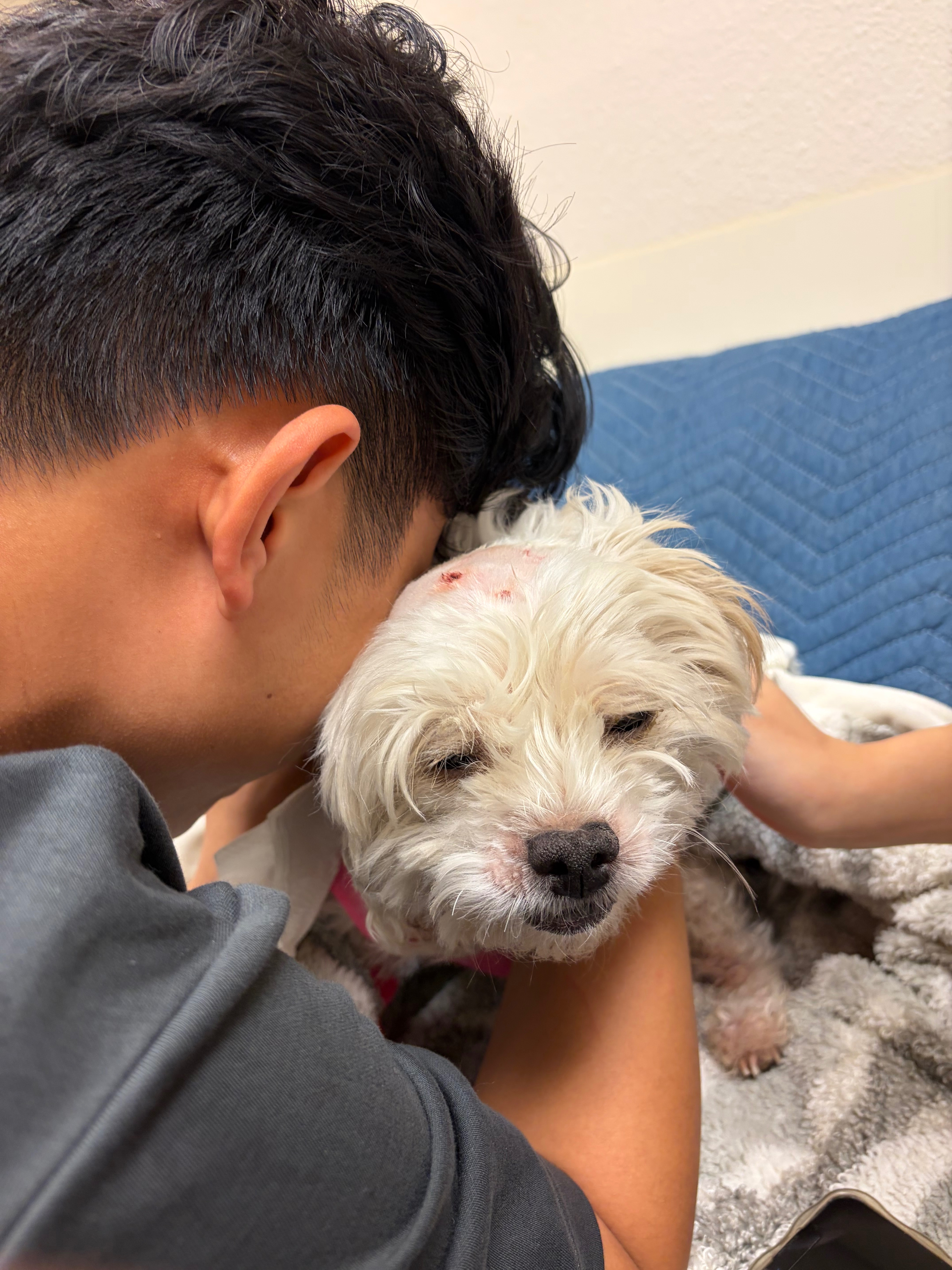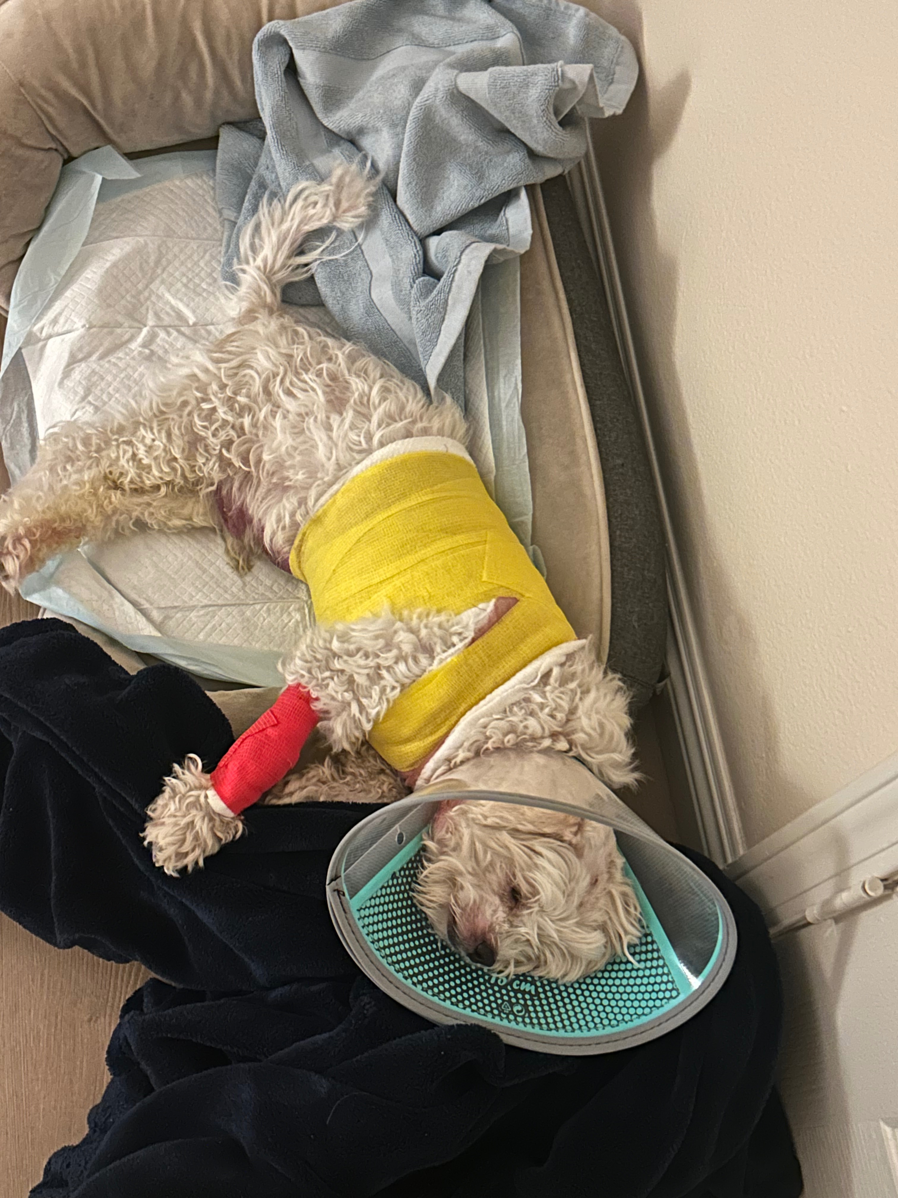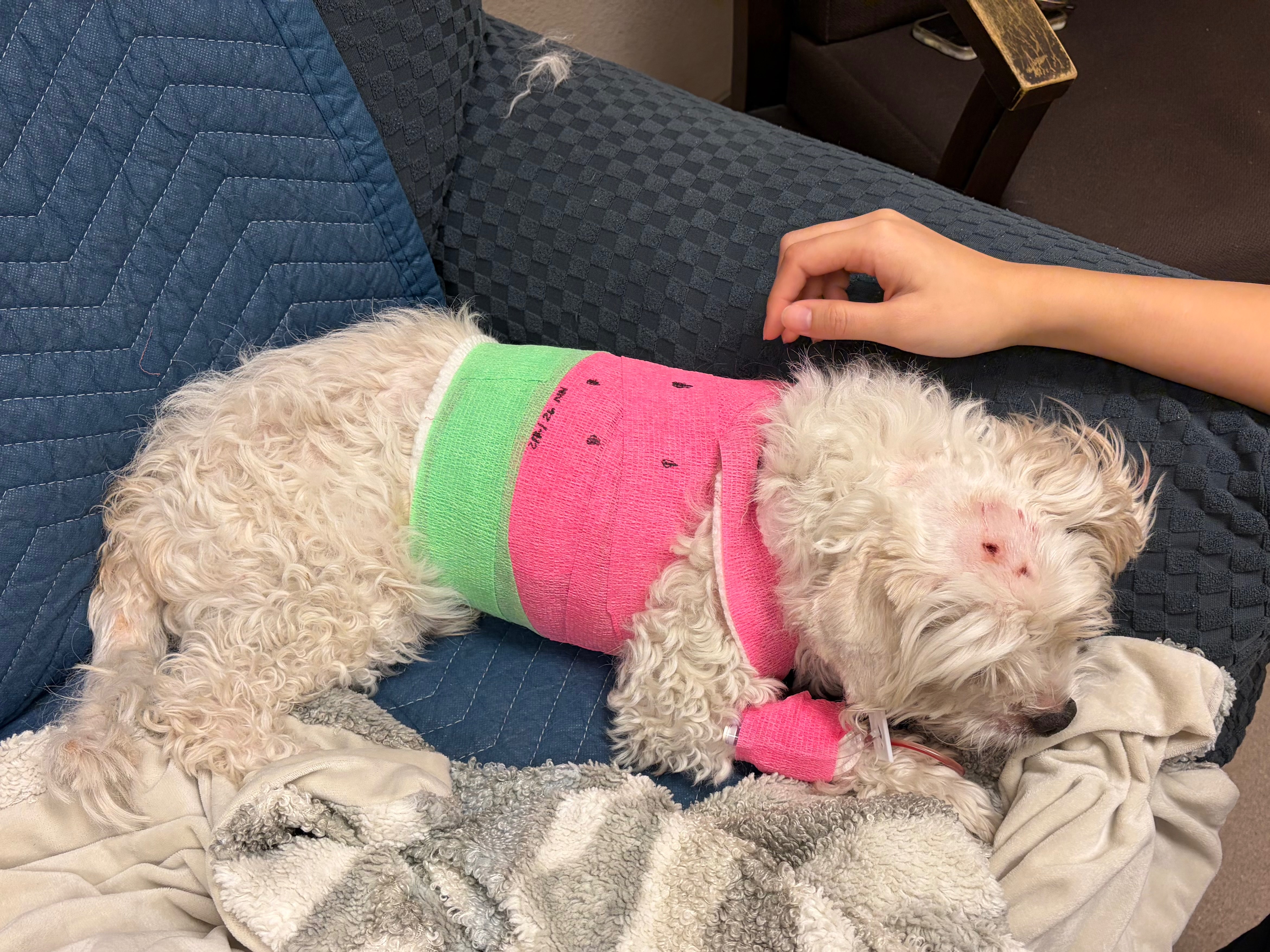 Over this past weekend, I came home from dinner to find my Toby covered in blood at his stomach and legs, and a trail of his blood coming from the backyard. There have been coyote sightings in our area, but my family and I never thought much of it at the time. I frantically took him to urgent care for animals, and they confirmed that multiple coyotes got to my Toby, biting his stomach, chest, neck, head, butt, and legs. He walked away with several bite marks, 3-4 broken ribs, a punctured chest, and in need of a possible stomach surgery. The doctors gave me a 60% survival rate as he lost a lot of blood and his heart rate was extremely high from the attack. Luckily, Toby is a strong soldier and beat the odds. He now goes to his daytime clinic for further treatment and is recovering slowly.