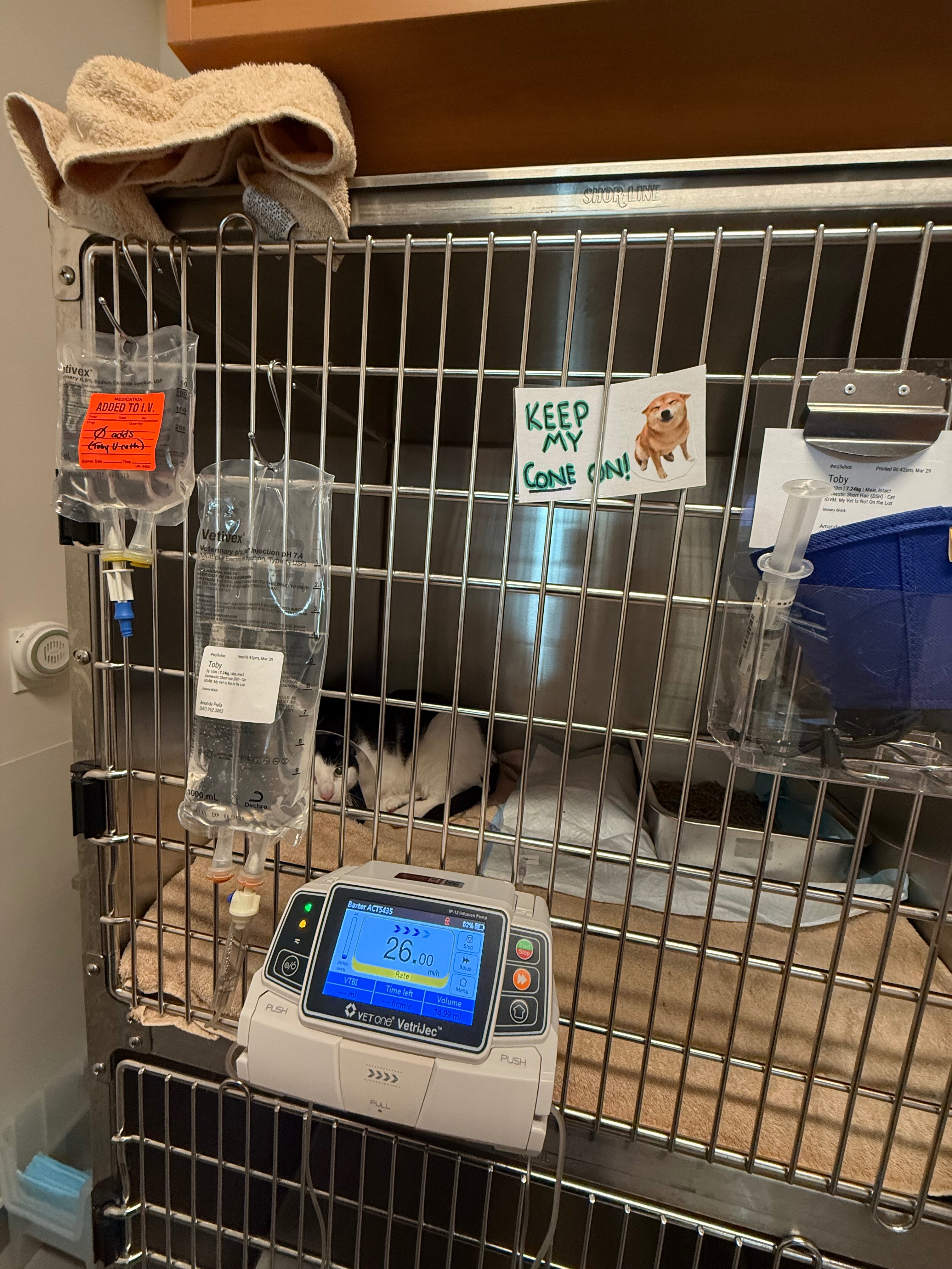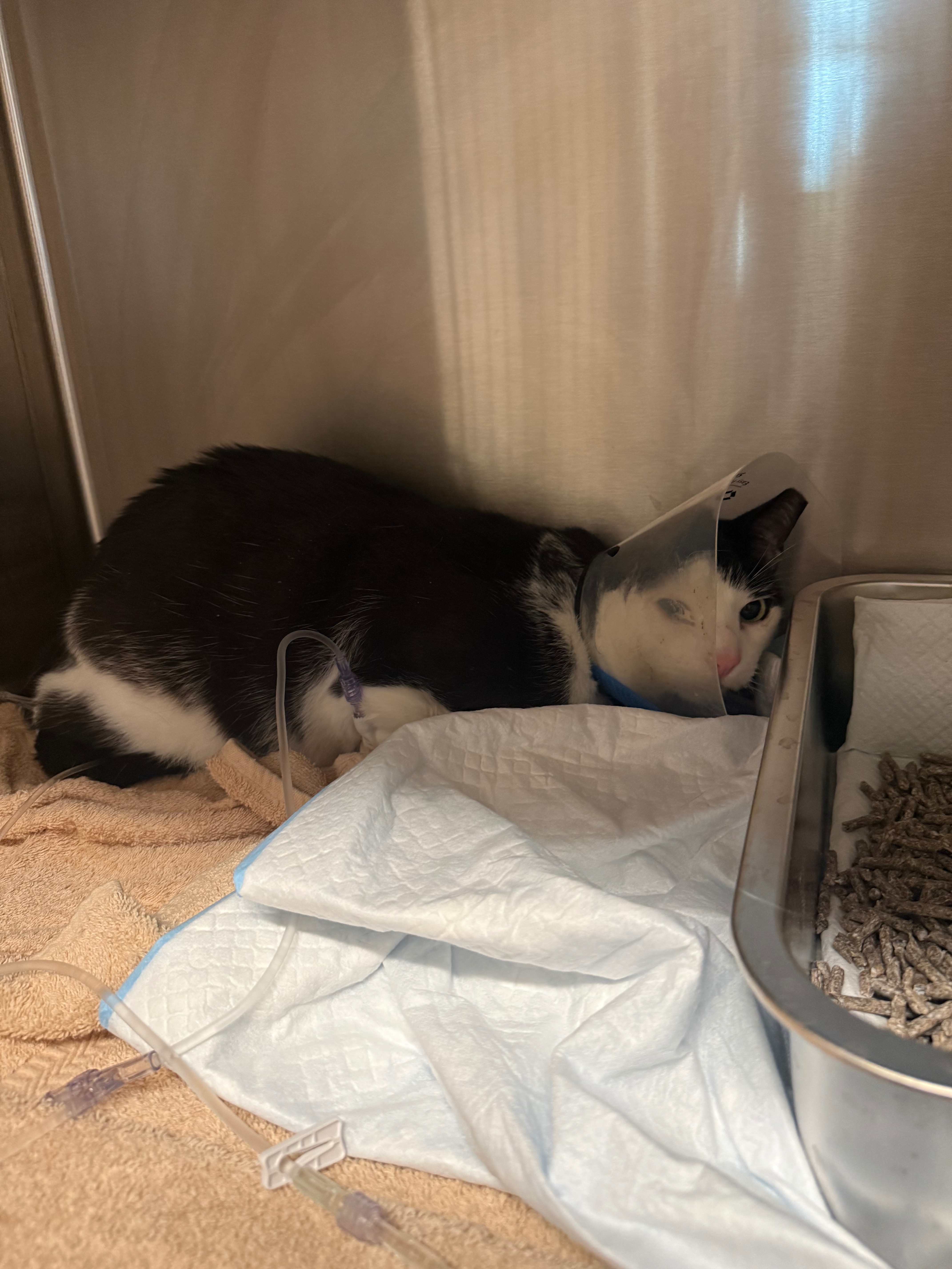 Toby se enfermó de repente y tuve que llevarlo de emergencia al veterinario. Le diagnosticaron una obstrucción urinaria y complicaciones en los riñones, una condición muy grave que requería tratamiento inmediato para salvar su vida. Lo tuvimos que internar de emergencia para salvar su vida.