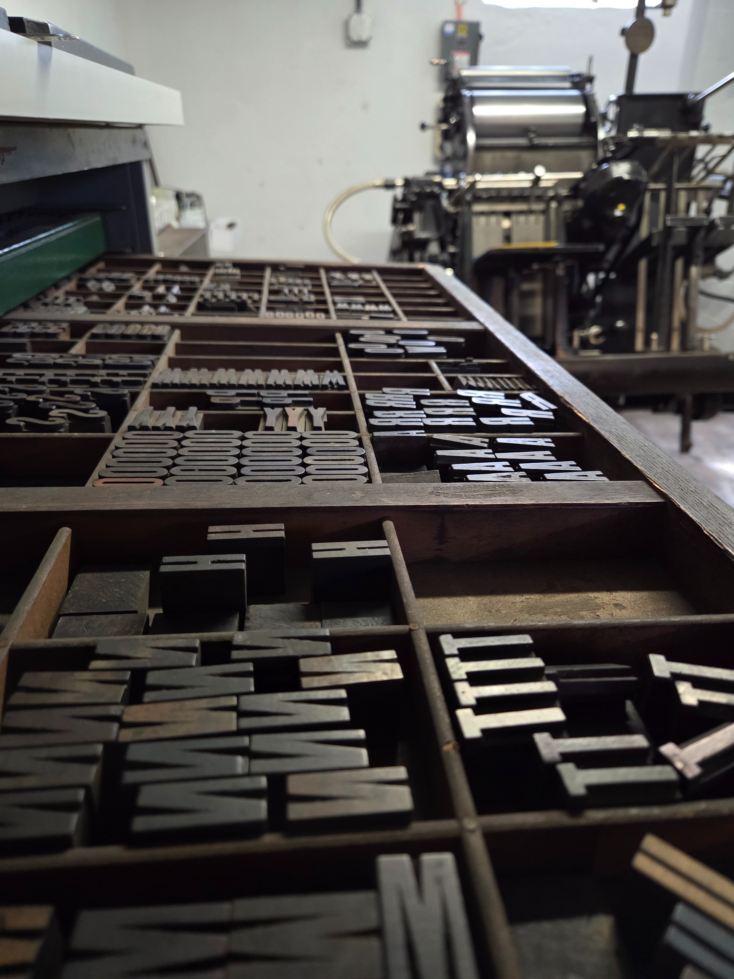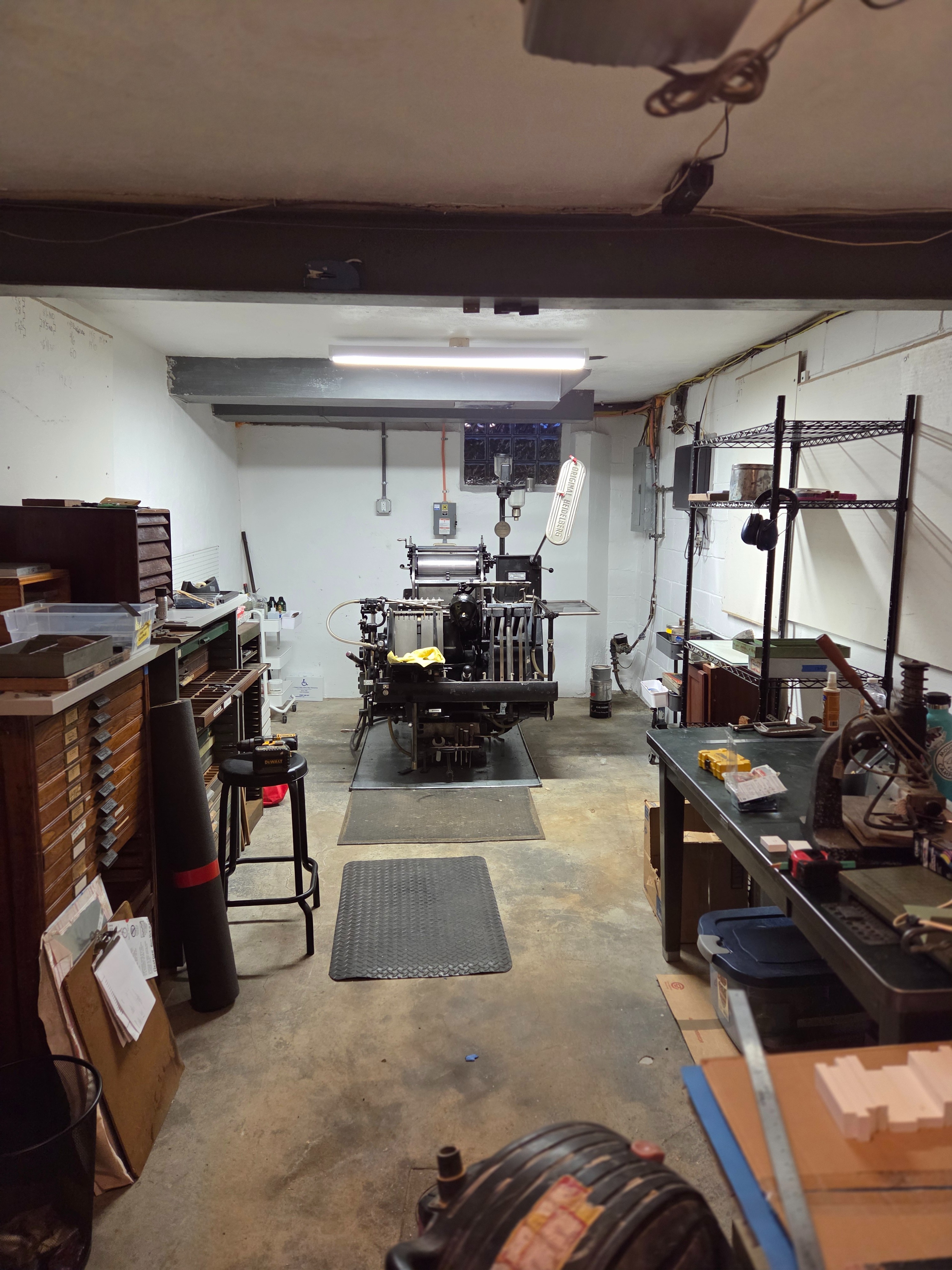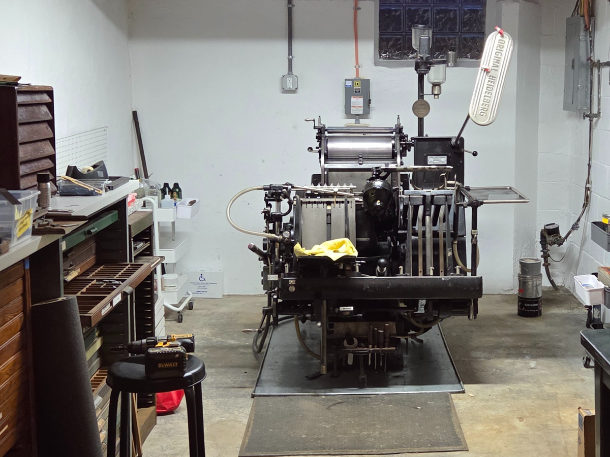 Last winter, I was connected to Alisa Dix of Third Termite Press who needed to find a new home for her collection of machines and type she built up over decades. By helping her with this bittersweet task, I met even more letterpress friends and was able to acquire well-loved type and ephemera, and very importantly, the Heidelberg Windmill press that I need your help to keep running! The press left its garage home in Oakland (that’s in Pittsburgh) in July and over-wintered in a very gracious friend’s garage here in Swissvale. This past March, it moved to yet another (final) garage where I now get to do the thing I love most once again.
