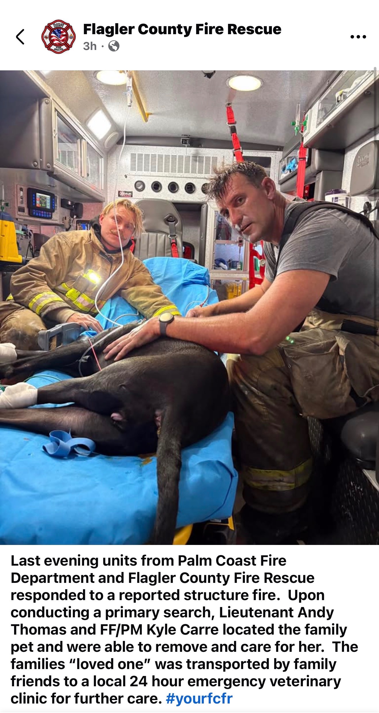 In a desperate attempt to save her, Matt and Tovia tried racing into the smoke-filled home multiple times, but was unable to see or reach Kira. Thankfully, the firefighters arrived just in time and entered the home to rescue her. Kira was immediately in need of CPR and required fluids and oxygen while being transported to an emergency animal hospital 40 minutes away.