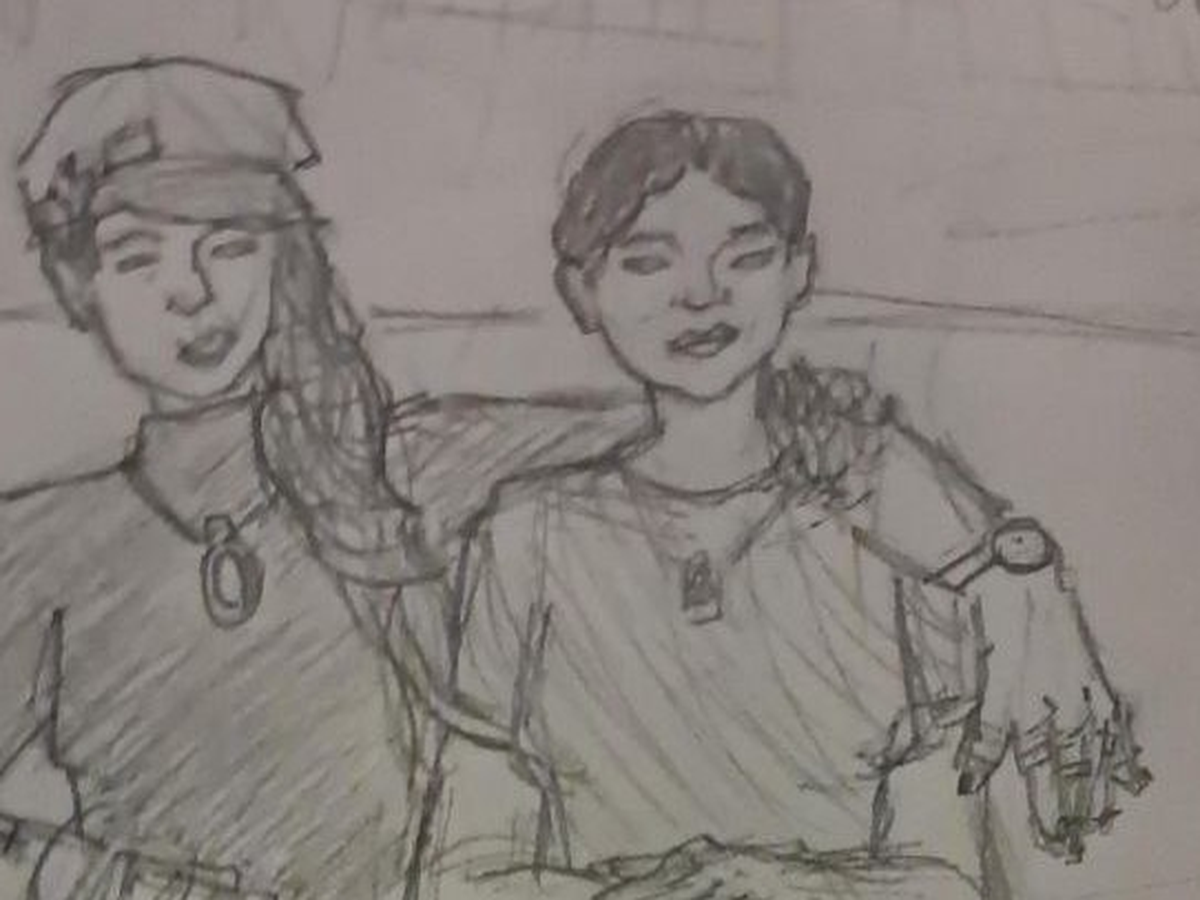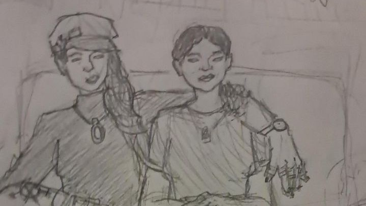 T (pseudonym) is a 21 year old Wasian trans girl from Washington Heights, NYC, who's spent most of her life bouncing between the Heights and Harlem. She's pictured on the left, her girlfriend on the right, in this sketch drawn by her little sister.