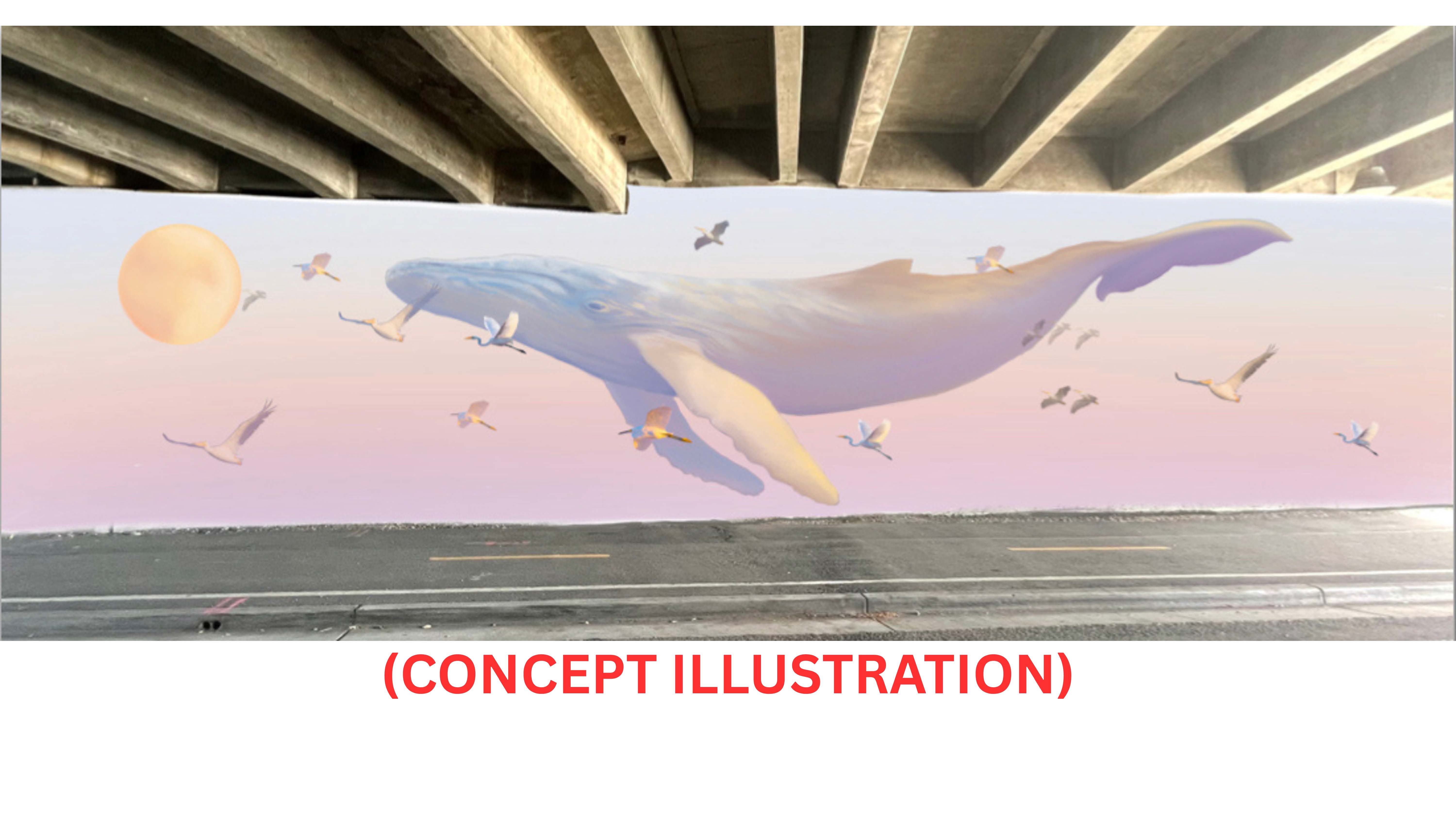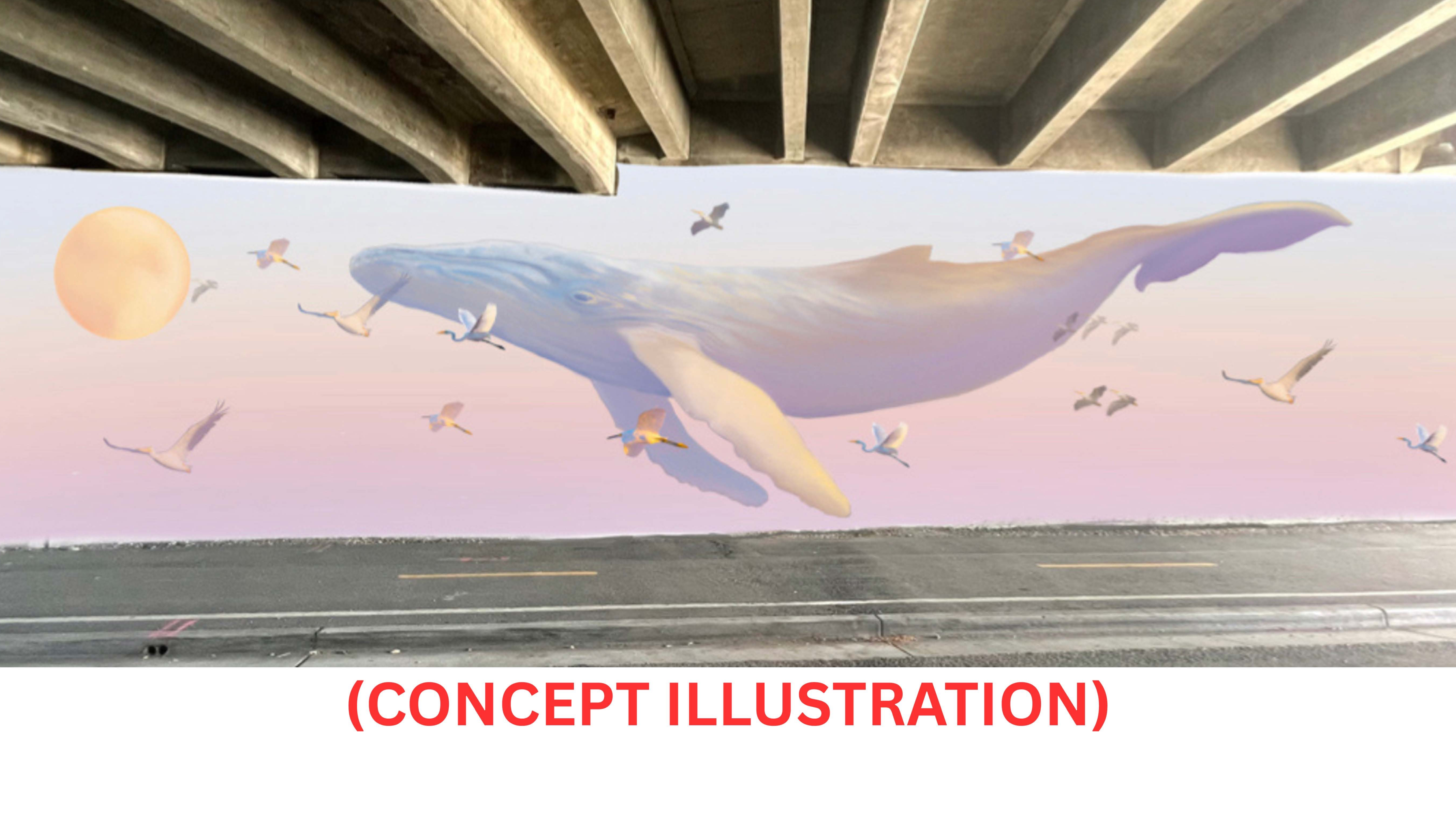 Imagine a vibrant, dreamy scene transforming the Wornum Way underpass between Larkspur and Corte Madera—a life-sized whale swimming in a pink sky, surrounded by graceful white pelicans and egrets from our local wetlands. This is the vision of a dedicated local artist and professional muralist, Rachel Hebert.