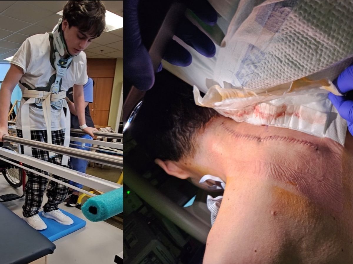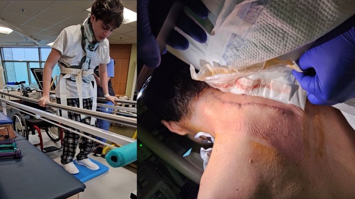 He came out of surgery with significant loss of use of his left arm and extreme loss of use of both legs. He was released from the hospital 6 weeks after surgery.