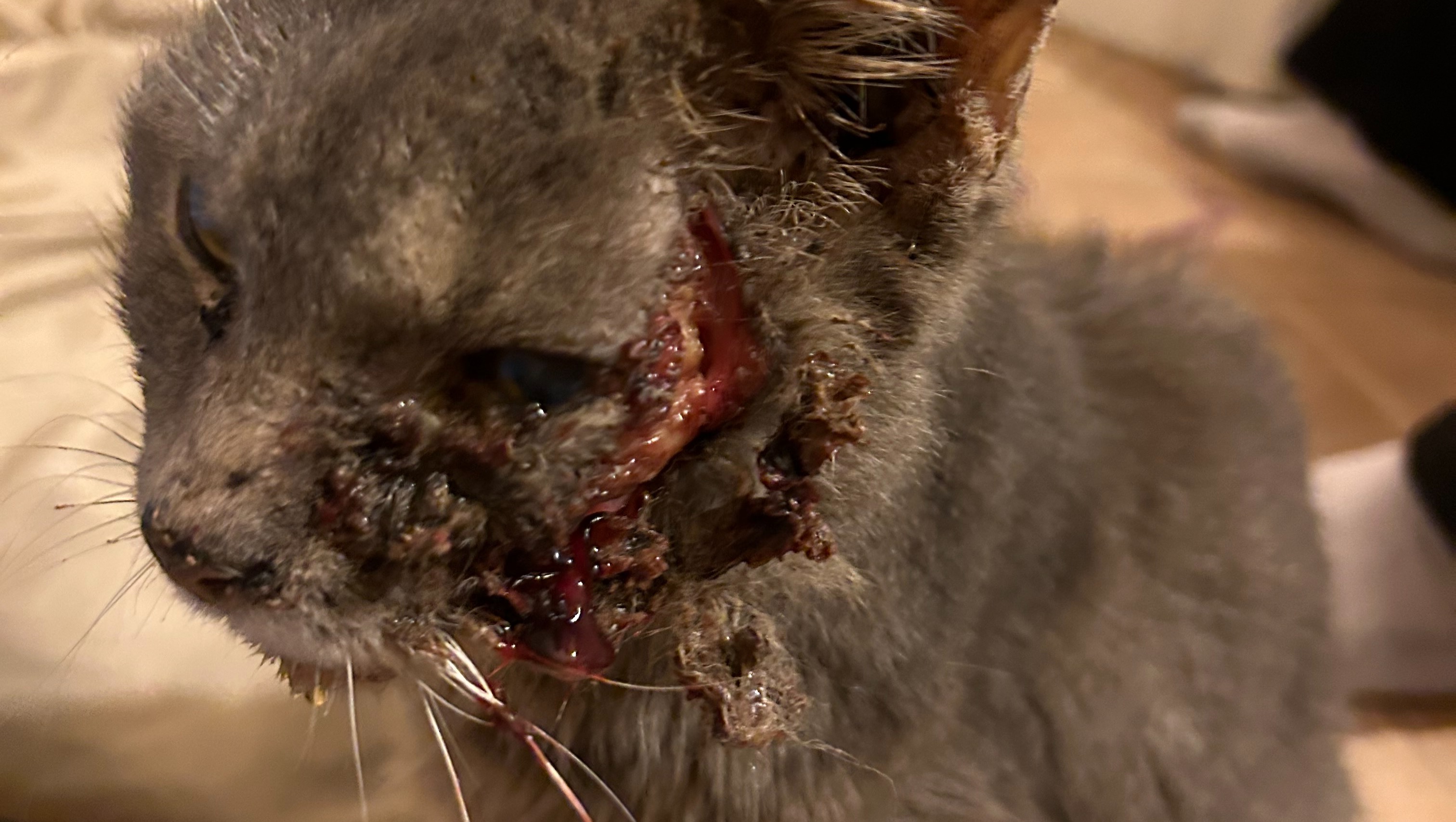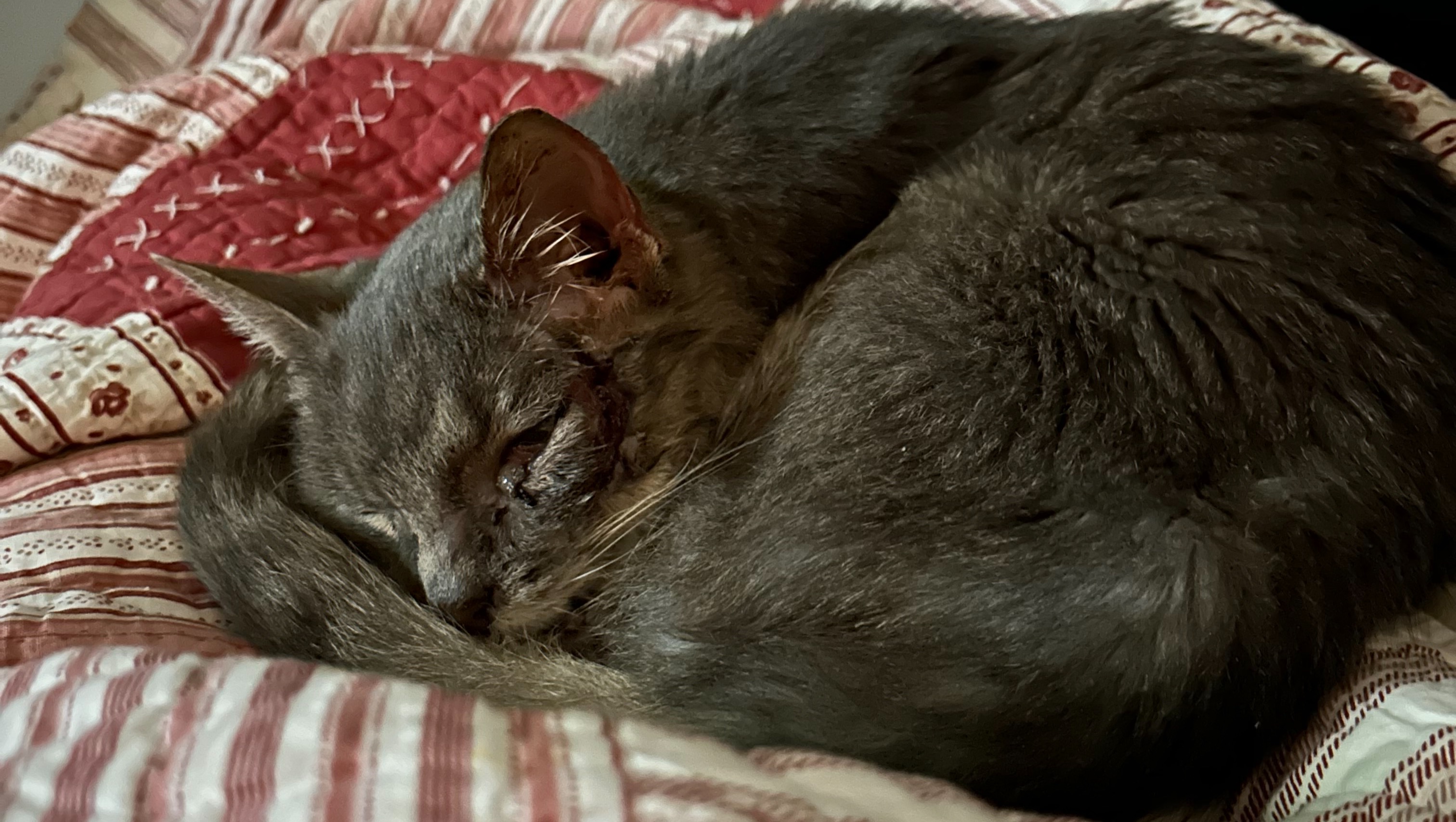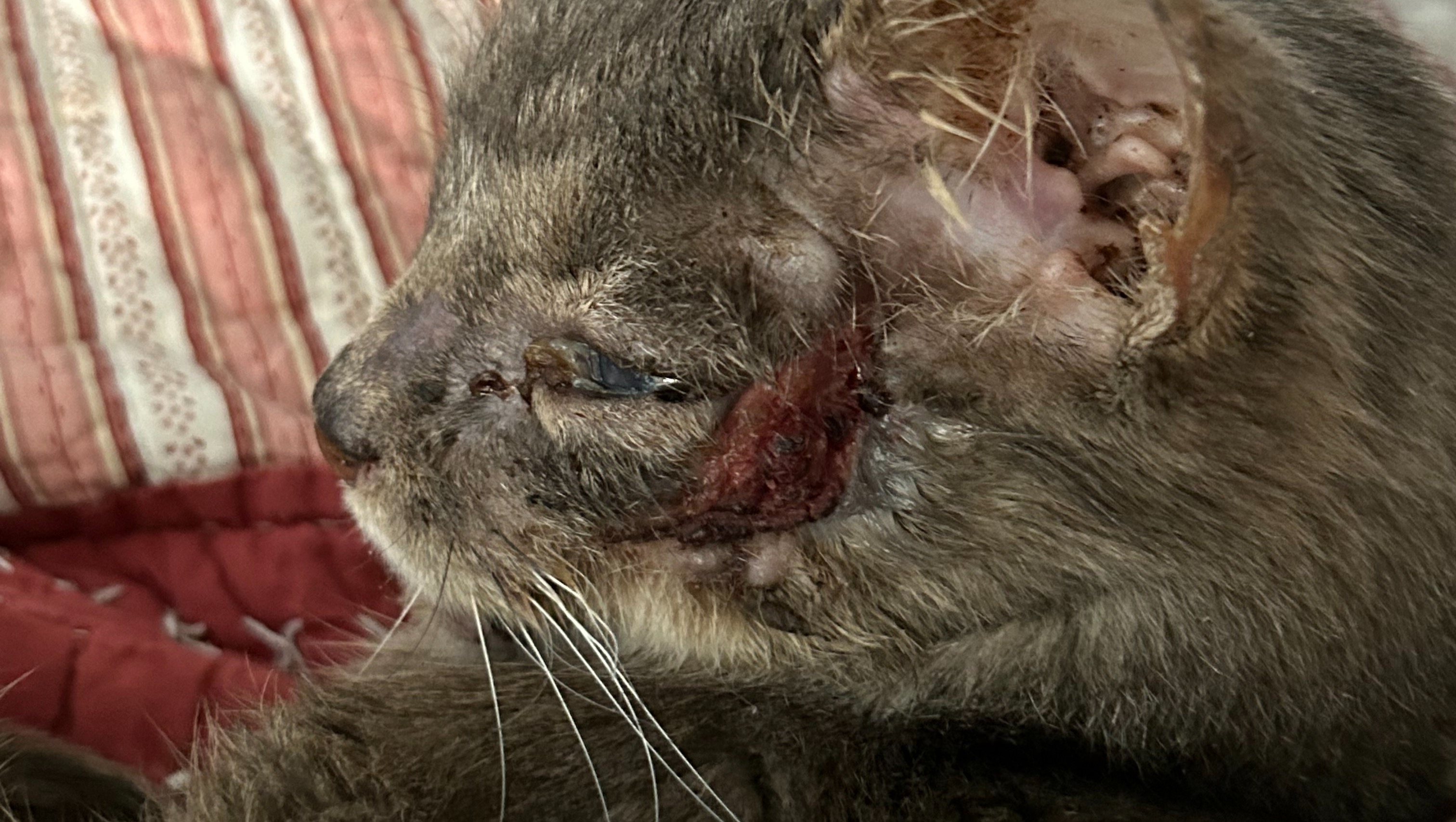 Now onto the update! Firstly, we discovered that Tyson is actually a female, so she now goes by Ms. Tyson! After we took her in, we were able to get her medical treatment to partially close the wound up, get her antibiotics for her infection, as well as get treated for fleas, dehydration, and anemia. This left her with an open wound on her face that we are currently tending to by providing her with antibiotic ointment on the wound three times a day. She went back to the vet a second time this past Friday (02/23) and they were able to close the wound even more! However, they discovered that she also has a fractured jaw as a result of being hit by a car. She will be going back next week to address the new situation and possibly remove some teeth. However, she has been eating and drinking so perfectly, we had no idea that she had this issue. She is still the affectionate, loving cat that we feel in love with and now even more so. She is still recovering, so she has mostly been relaxing and sleeping, but her recovery process is going so well we couldn't be anymore excited for her.