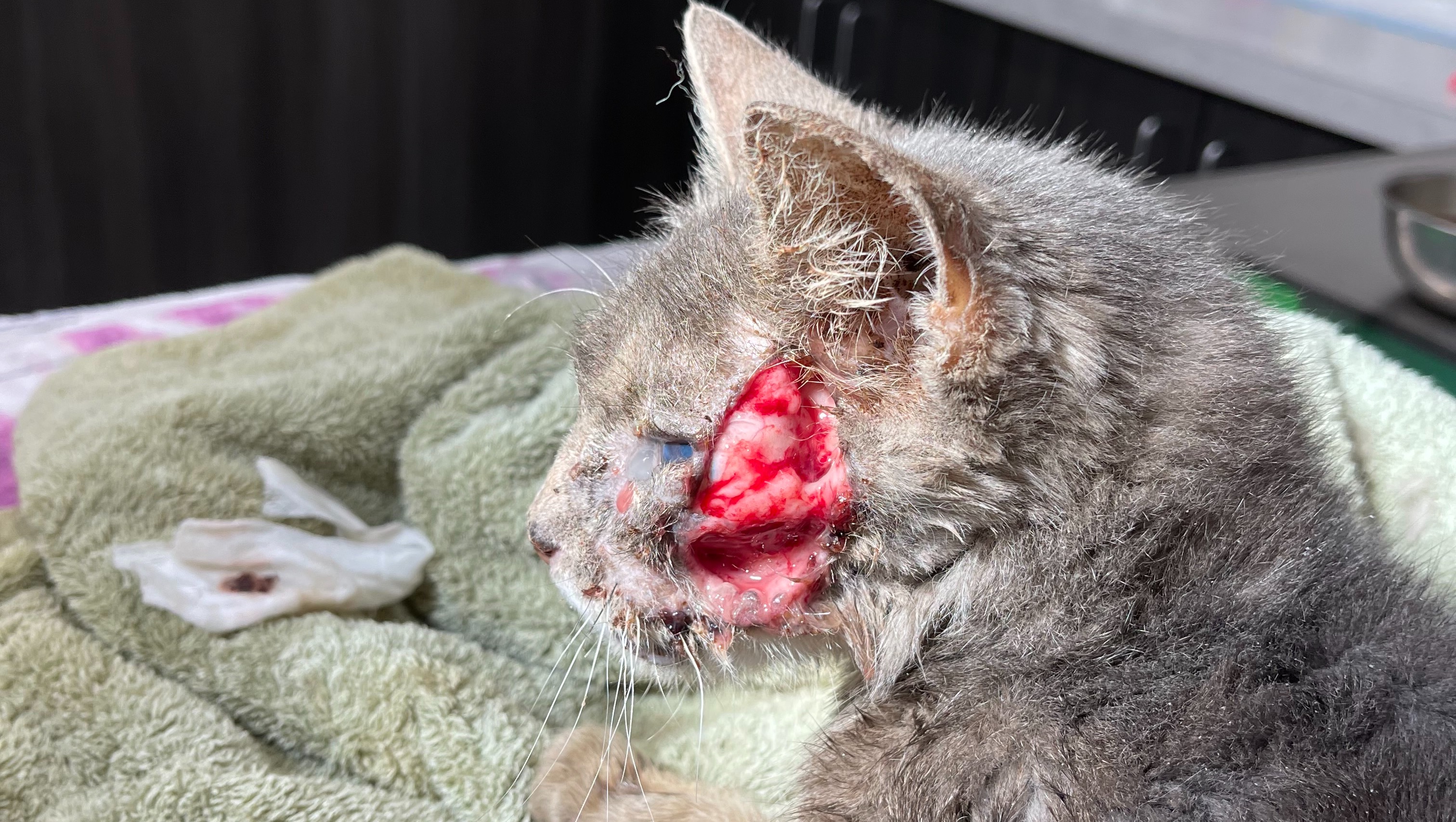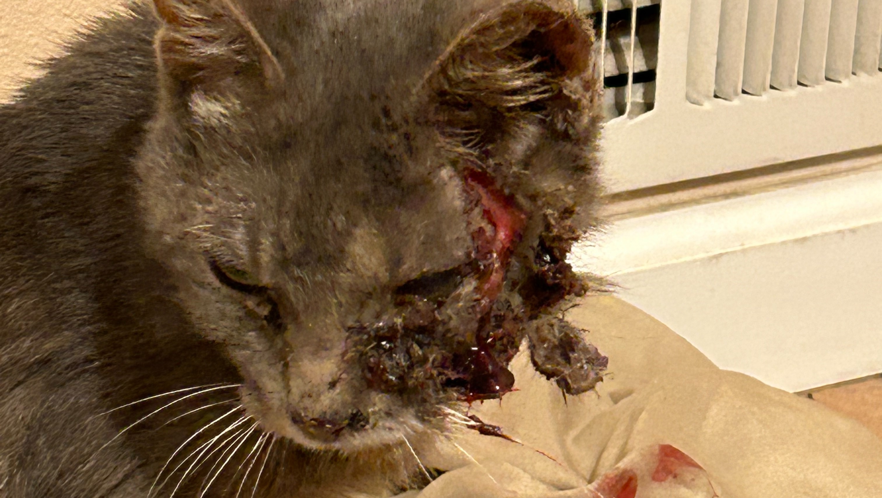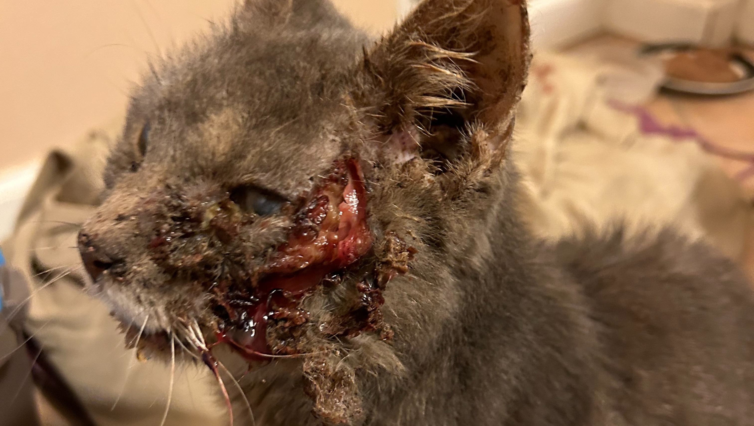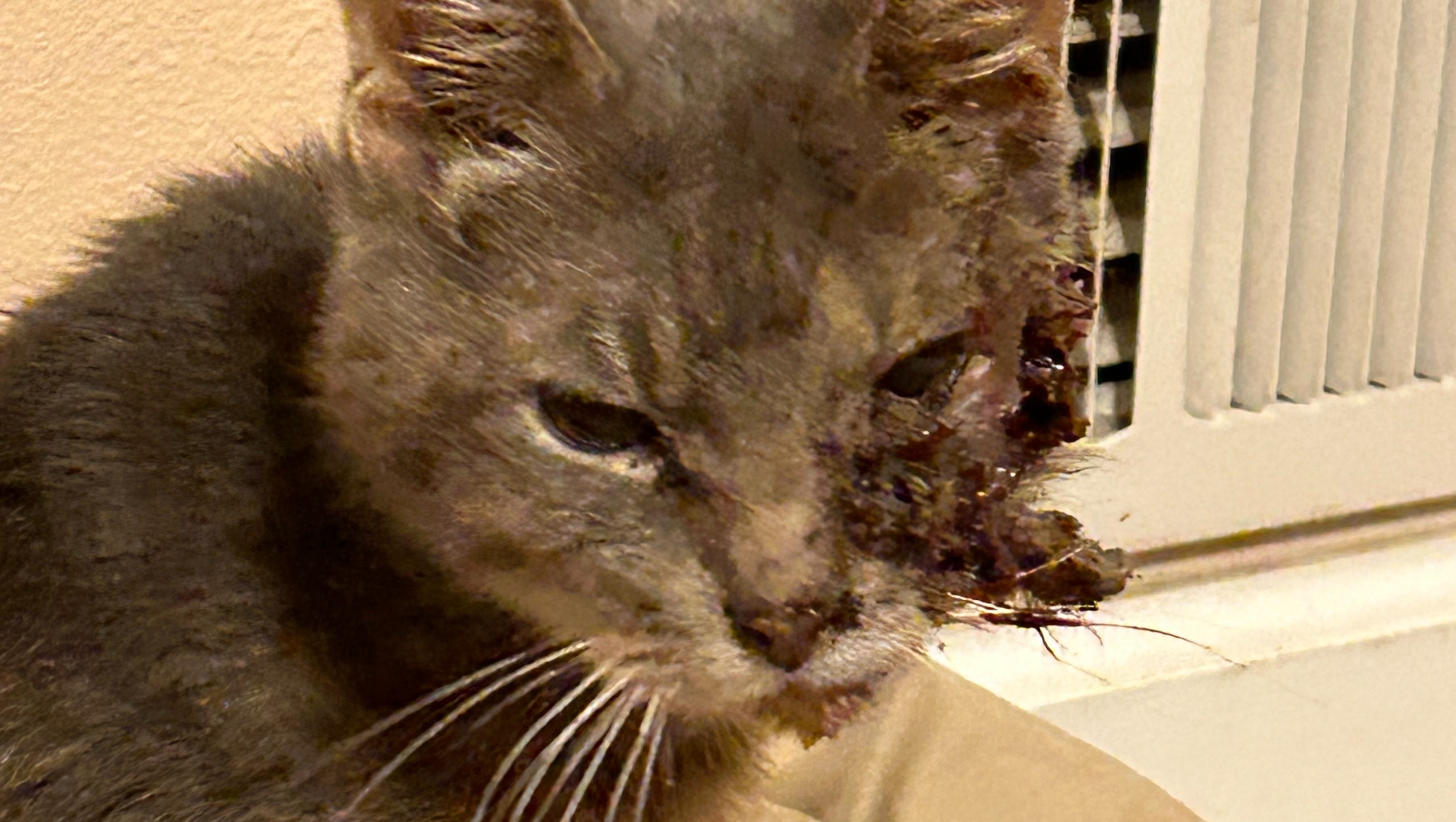 Now onto the update! Firstly, we discovered that Tyson is actually a female, so she now goes by Ms. Tyson! After we took her in, we were able to get her medical treatment to partially close the wound up, get her antibiotics for her infection, as well as get treated for fleas, dehydration, and anemia. This left her with an open wound on her face that we are currently tending to by providing her with antibiotic ointment on the wound three times a day. She went back to the vet a second time this past Friday (02/23) and they were able to close the wound even more! However, they discovered that she also has a fractured jaw as a result of being hit by a car. She will be going back next week to address the new situation and possibly remove some teeth. However, she has been eating and drinking so perfectly, we had no idea that she had this issue. She is still the affectionate, loving cat that we feel in love with and now even more so. She is still recovering, so she has mostly been relaxing and sleeping, but her recovery process is going so well we couldn't be anymore excited for her.
