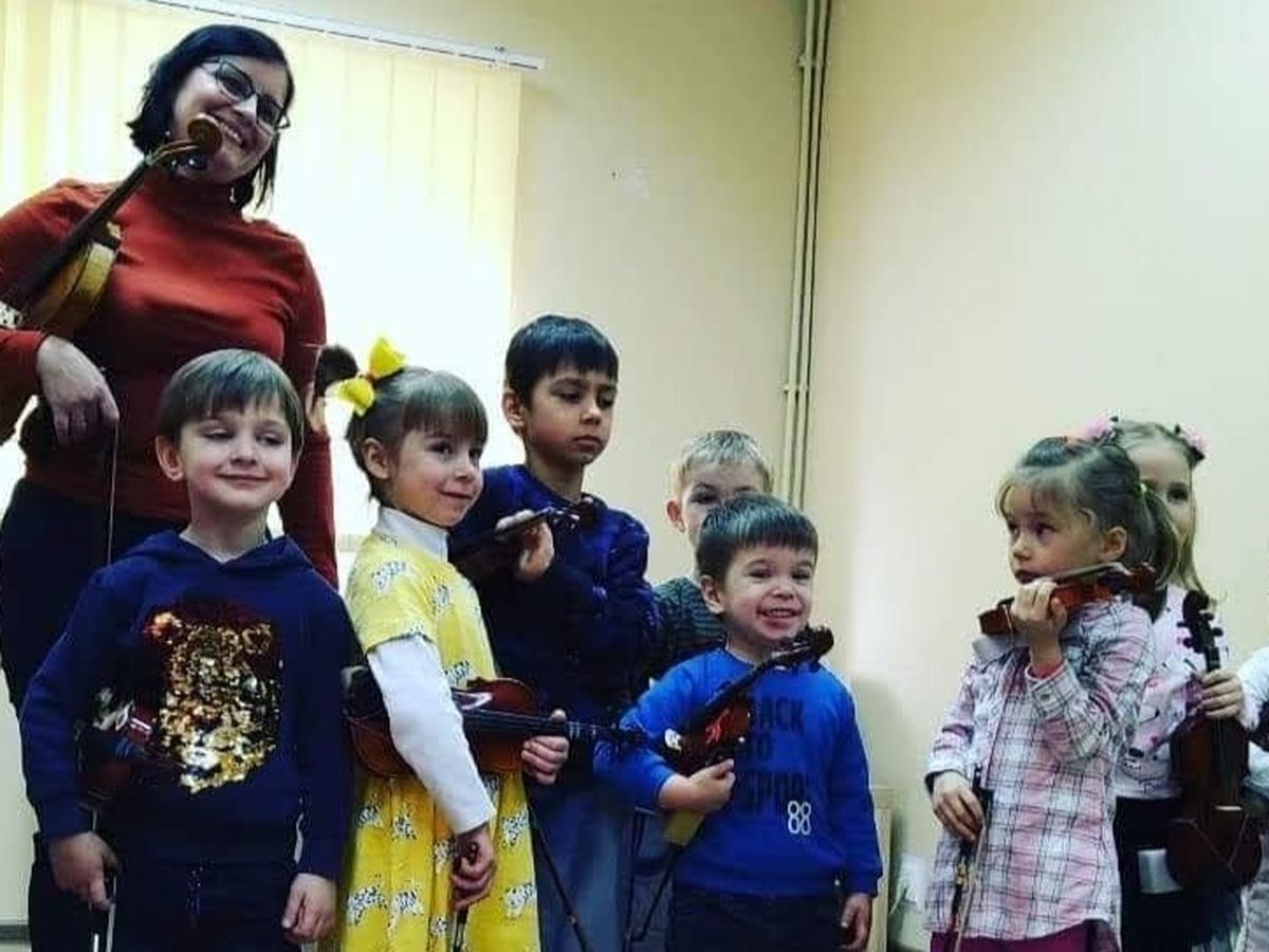 Photo: Nataliia Koptienkova (president of the Ukrainian Suzuki Association) and her students.