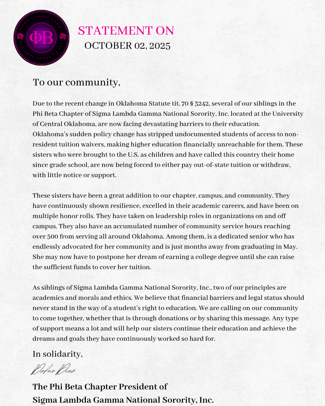 Hello, my name is Dafne Diaz, and I am honored to serve as the President of the Phi Beta Chapter of Sigma Lambda Gamma National Sorority, Inc. at the University of Central Oklahoma this year. Today, I want to bring to light an urgent issue impacting of our sister and fellow students.