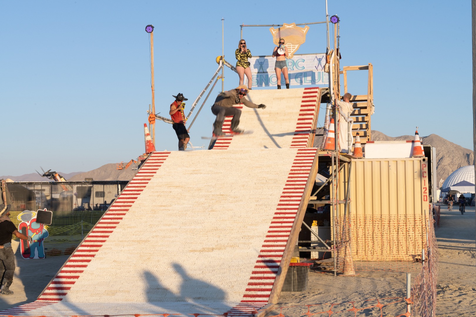 We’re BRC Snow Club, the camp that brought the first and only dry ski slope to Burning Man in 2023. That’s right… a real, rideable slope in the middle of the desert, complete with a fully staffed rental shop with skis, snowboards, and even sleds!