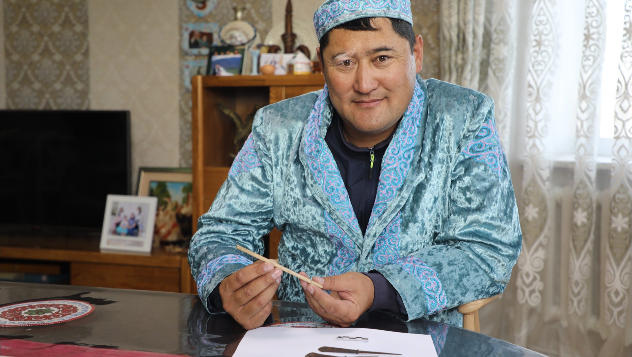 Sagsai Mayor B. Bekbolat with an ancient Mongol Empire arrow discovered in the region