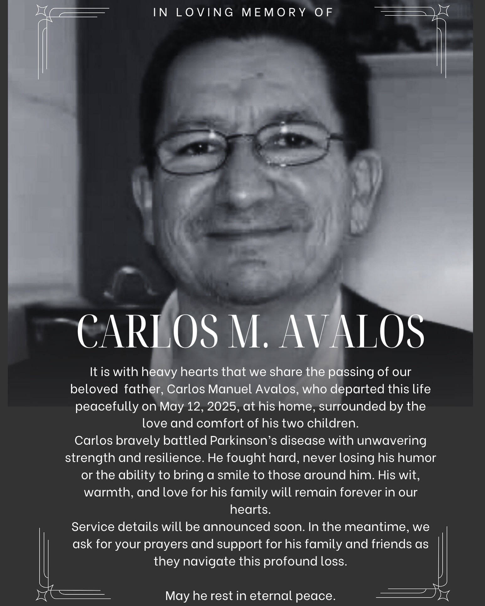 On May 12, 2025, our beloved father, Carlos Avalos, passed away peacefully, surrounded by the two people who meant the world to him—his children. After an incredibly brave and inspiring 30-year battle with Parkinson’s disease, he left this world with the same strength, grace, and love that defined his life.