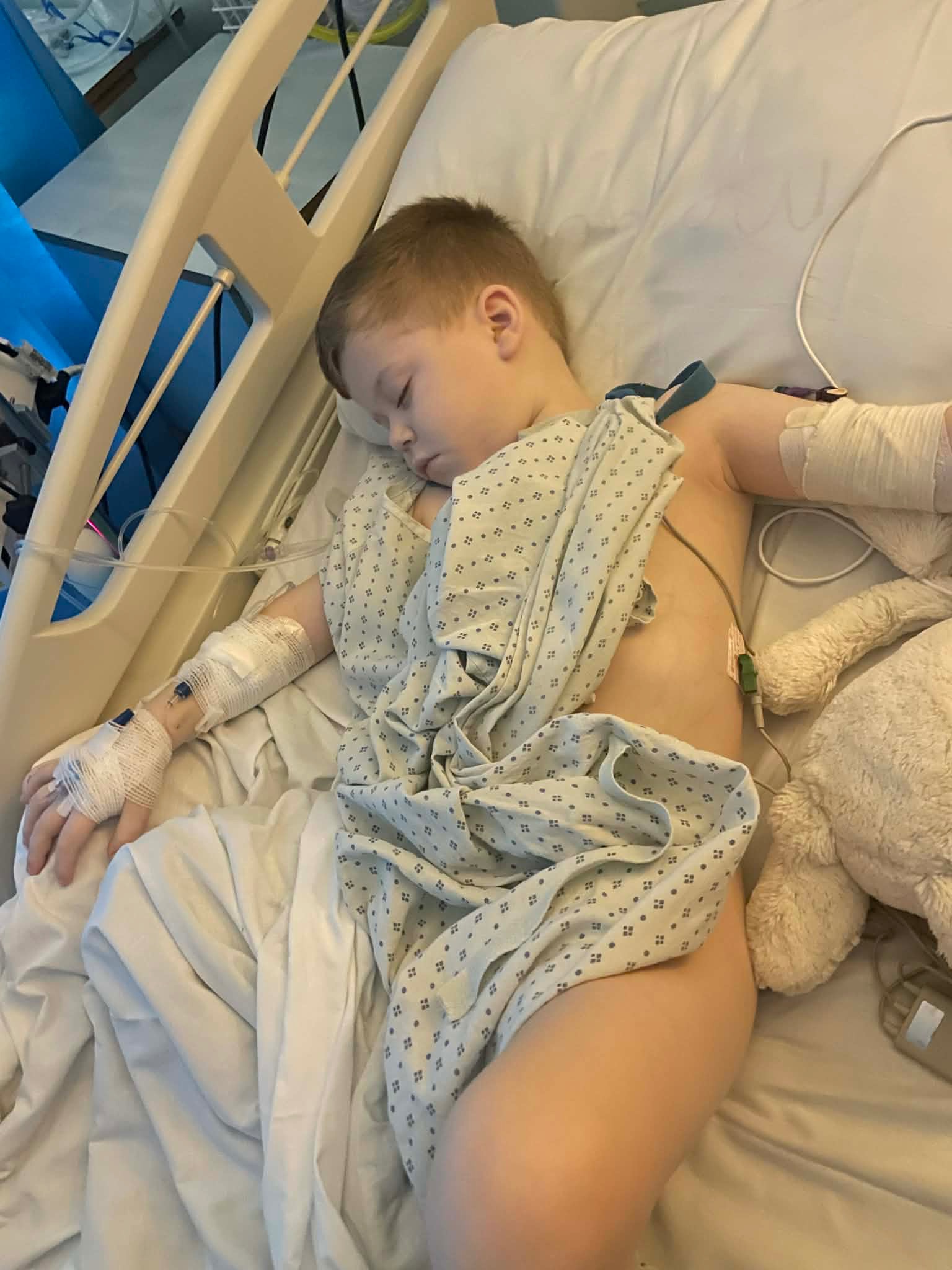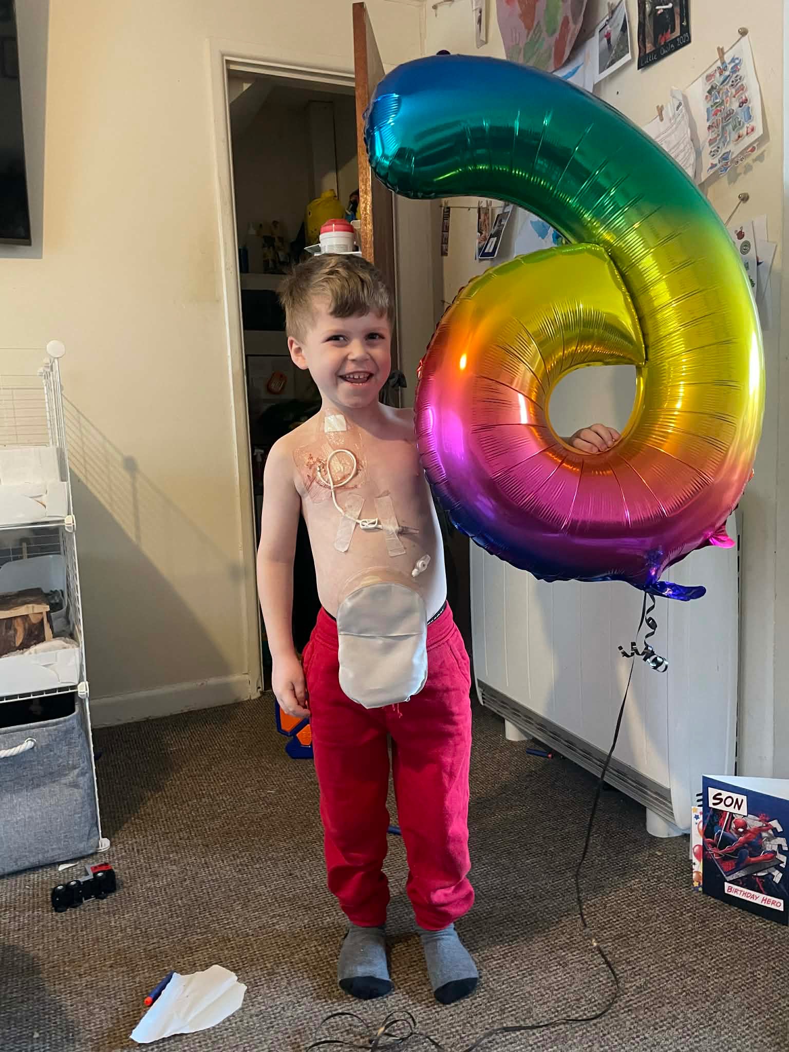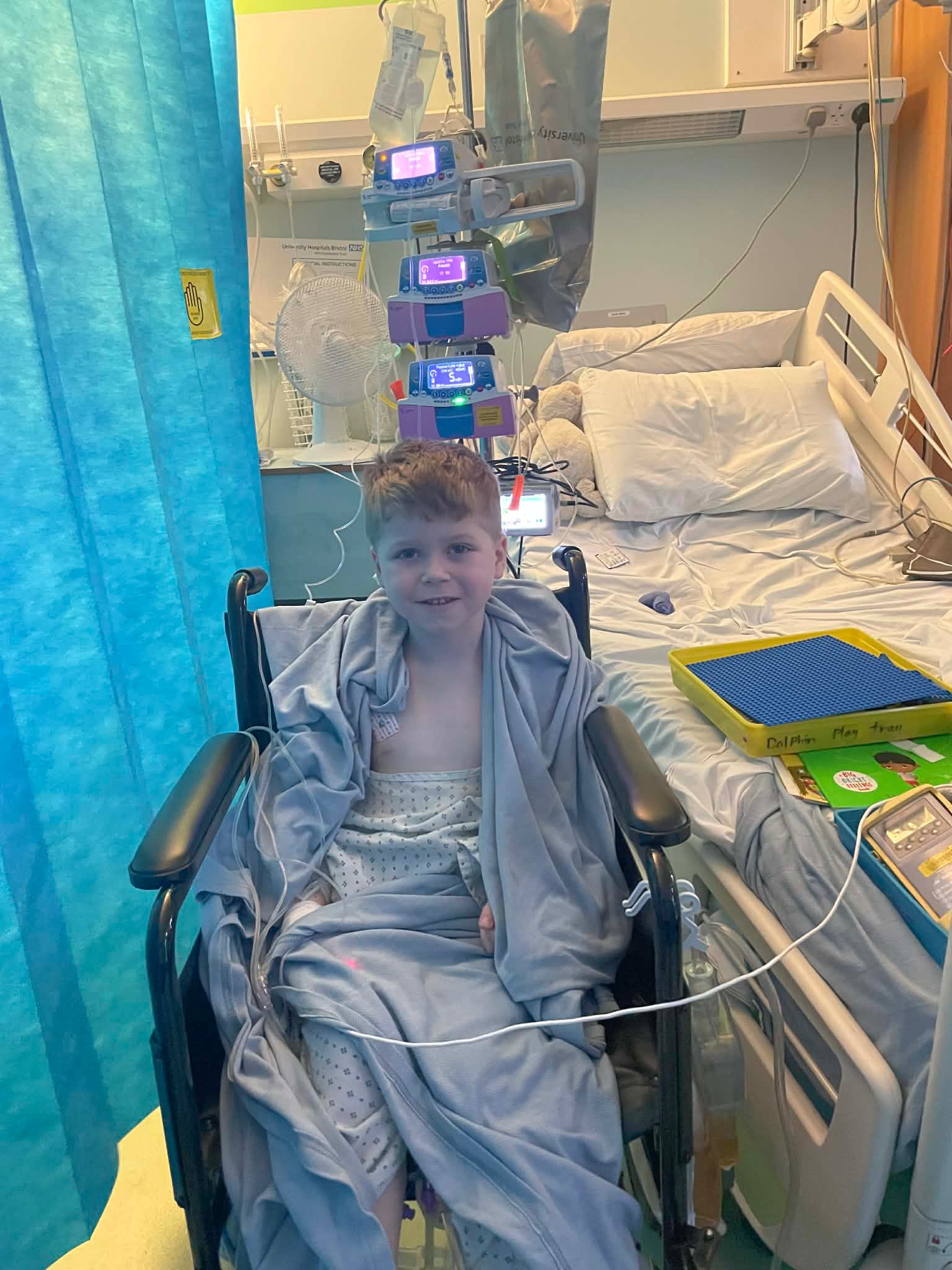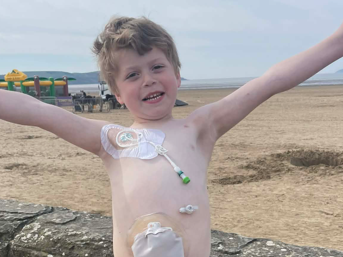 Reuben lives with intestinal failure and depends on complex medical care every single day. He has a stoma, a PEG tube to help relieve severe pain and vomiting during pseudo-obstruction episodes, and he receives Parenteral Nutrition (PN) through a Hickman line. Because his nutrition is delivered directly into his bloodstream, everything must be prepared and connected in a clean, sterile environment to reduce the risk of infection.