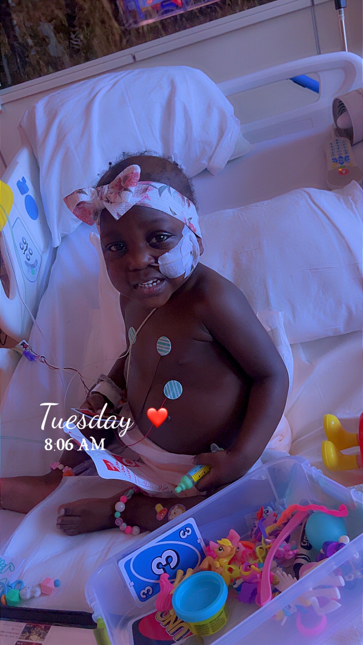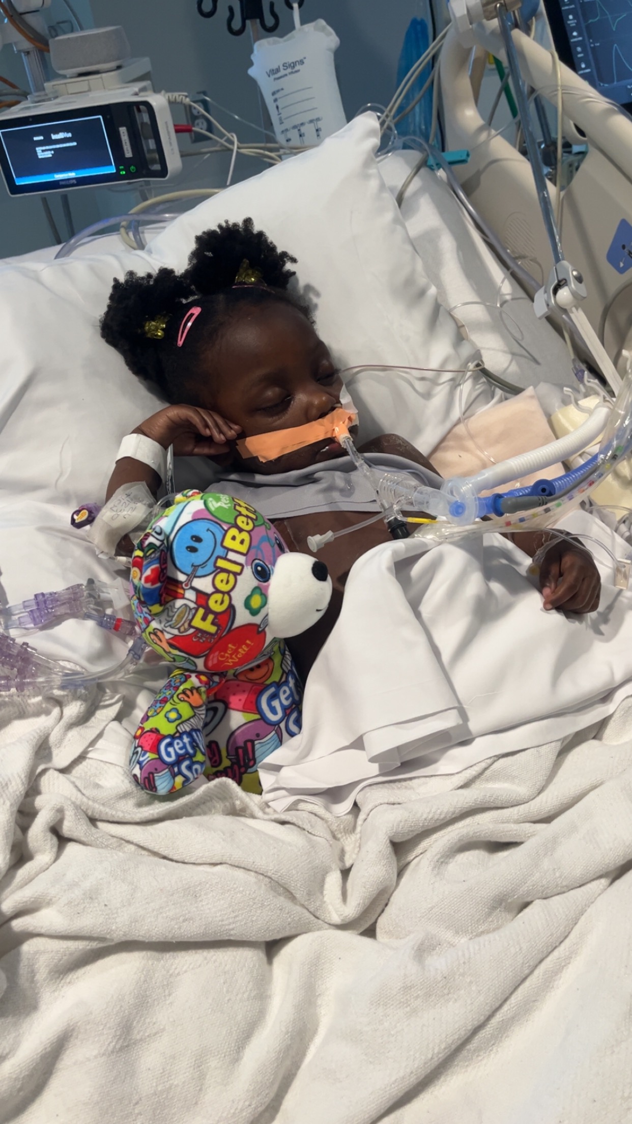 While at LeBonheur Children’s Hospital, TreNae had to be placed under heavy sedation for nearly two weeks just to keep her alive. When she would cry or become upset, the largest tumor would swell and press against her lungs, cutting off her oxygen. Watching your child struggle to breathe is a pain that words cannot fully describe. The sedation wasn’t a choice — it was the only way to protect her life. She now has a PICC line and began chemotherapy about four weeks ago. Through everything, TreNae continues to fight with a strength that amazes everyone around her. By the grace of God, her tumors are beginning to shrink.