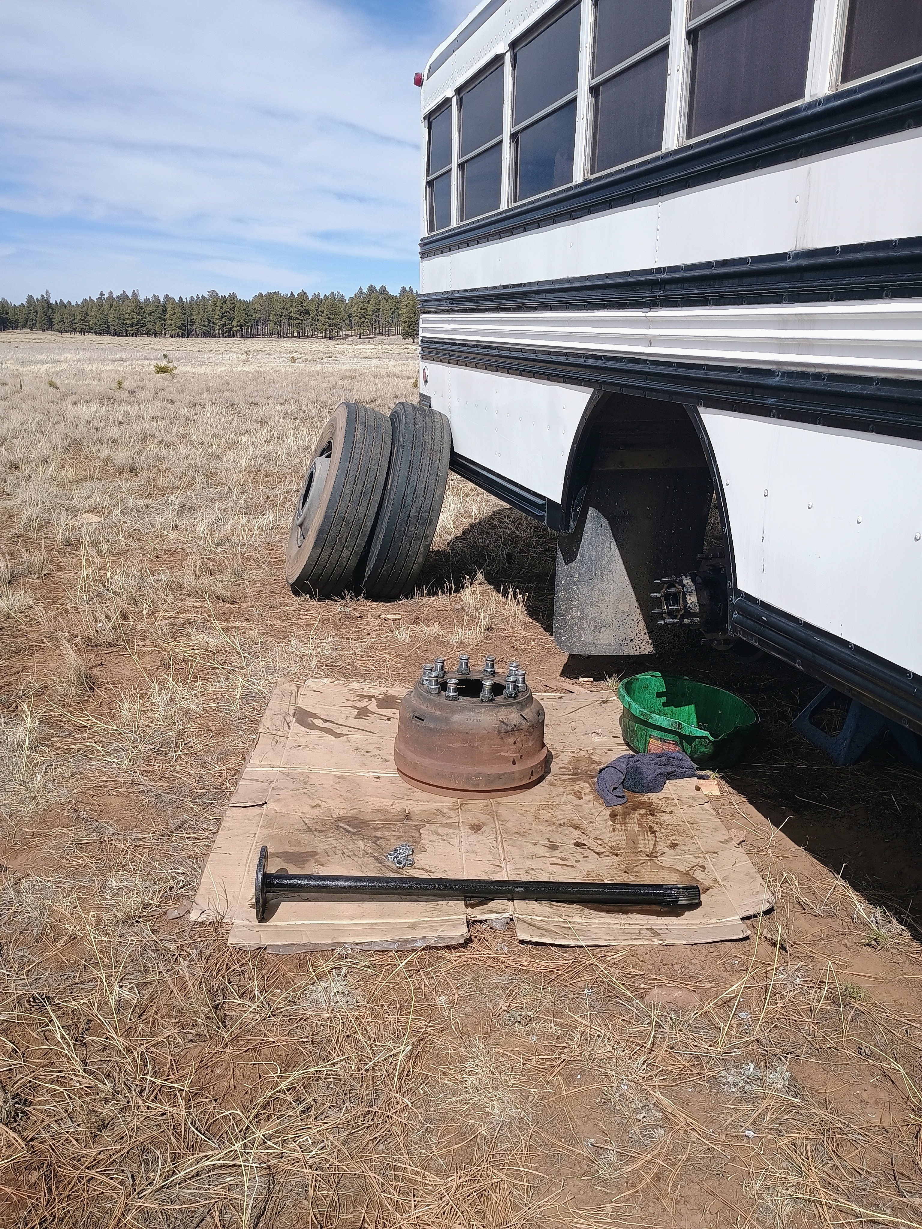 Recently, the bus developed a serious rear hub seal leak in the wheel assembly. This repair involves removing the heavy brake drum and wheel hub, replacing the seal, and ensuring the bearings and brakes are safe again. It’s not a small job, and because the bus is a large diesel vehicle, repairs are significantly more expensive than normal car work. Right now, the Nomadic Express is temporarily down, and without this repair we cannot safely move or continue our work. We live very simply and do most things ourselves, but this is one of those moments where we need a little help from the community.