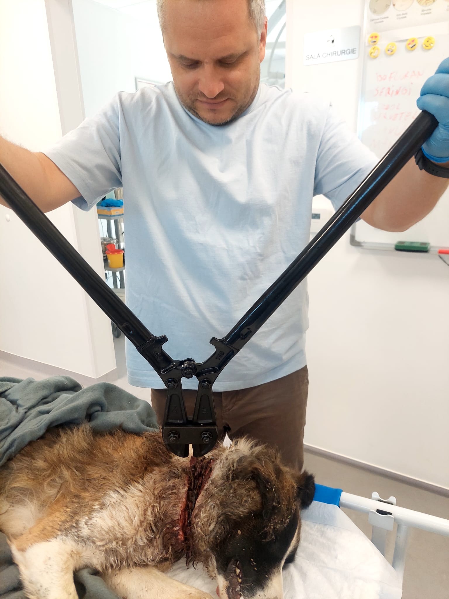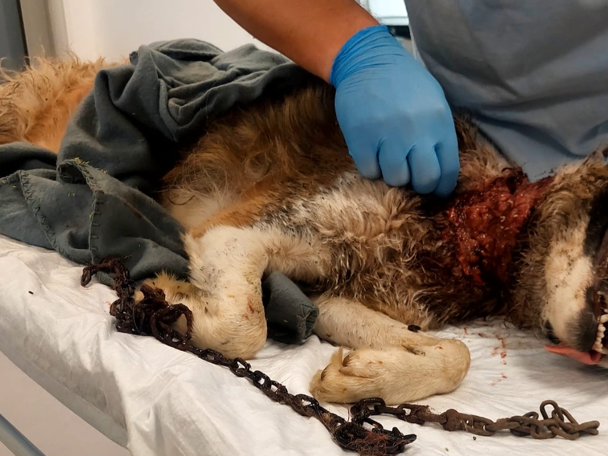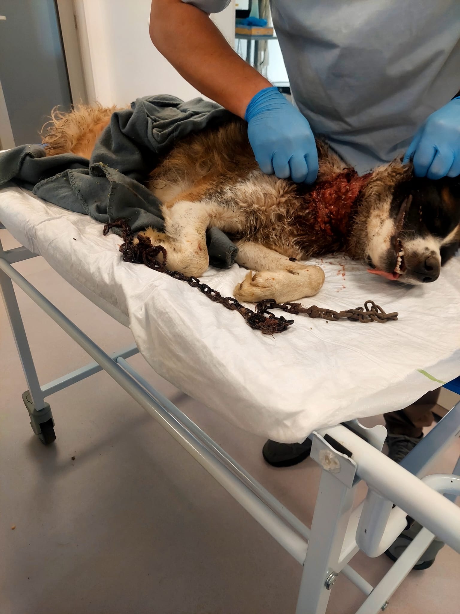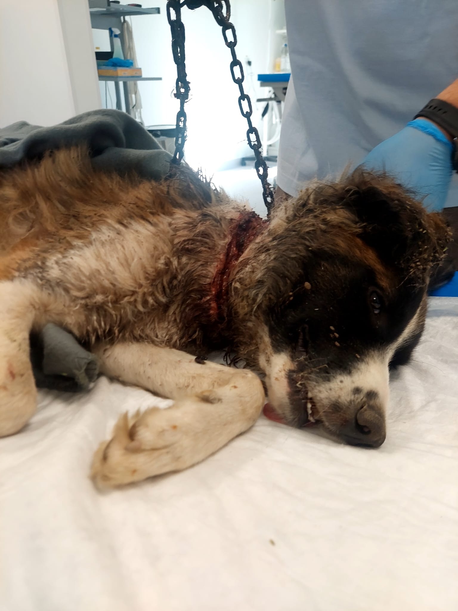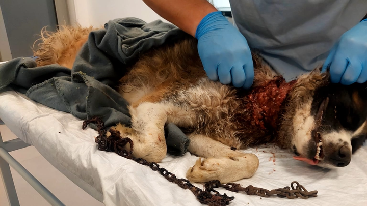 Hello, my name is Danny and I am hoping to raise funds to bring Rex to our home in the UK . While staying with relatives in Romania we heard a dog crying in pain and tracked down Rex to a nearby garden where he was chained up extremely tightly as you can see from the horrendous pictures. I don't know where he found the strength from but he had actually dug a hole in the rock hard ground just big enough for his head and neck to try and escape the flies. I truly couldn't believe my eyes with what I was seeing! We gave him some water and food and I drove to a nearby hardware store and bought some bolt cutters whilst my wife had managed to phone various people to try and get some professional help. We returned to Rex to cut his chains but I didn't realise how tight they were around his neck and me not thinking clearly I cut the chains to his fixed steak in the ground. We didn't expect it as he was extremely weak but once he realised he was free he leapt a fence and ran off. Now we really panicked because we thought we wouldn't see him again. After we had searched calling for him for sometime Florin arrived (more about him later) and this was the help my wife had been calling for on the phone. After searching for what seemed an eternity we went back to our relatives house exhausted intending to have a break and continue the search afterwards. We couldn't believe it when Rex came up to the gate but then scampered off. Me Florin and my wife followed Rex and once Rex stopped from exhaustion Florin managed to give him anaesthetic we got him into a create and to a vet. Rex is recovering amazingly as he was touch and go as to whether he would survive and the vet said he hadn't seen anything like this before which in Romania is quite something! I have never asked for money in the past and this is all new to me but I am asking if you could find it in your hearts for any donations so we can continue Rex recovery the vet bills food and accommodation untill he is fit enough to obtain a pet passport and I will personally drive my 20 year old van to him in Romania and bring him home. Rex and countless other dogs would not be alive now if it wasn't for Florin. This man works 2 jobs is looking after 50+ other dogs and cats and desperately needs help to feed and look after them . Some people may think the £2000 I am asking for is a lot for me to drive to Romania and bring Rex home but if I raise the full amount anything left from this will go to Florins animals needs. I will take photographs of every receipt so everyone knows where every penny is going. I am hopeful that this could be the start of bigger things regarding helping animals in Romania. I would love to be able to help Florin build some proper shelters for his animals and set up adoption to the UK for them and be directly involved with transportation etc but to start with I need to rescue Rex. I am not great with social media etc but I hope to make a Facebook account etc soon. If you need more pictures or videos please email me. Thank you. Danny.