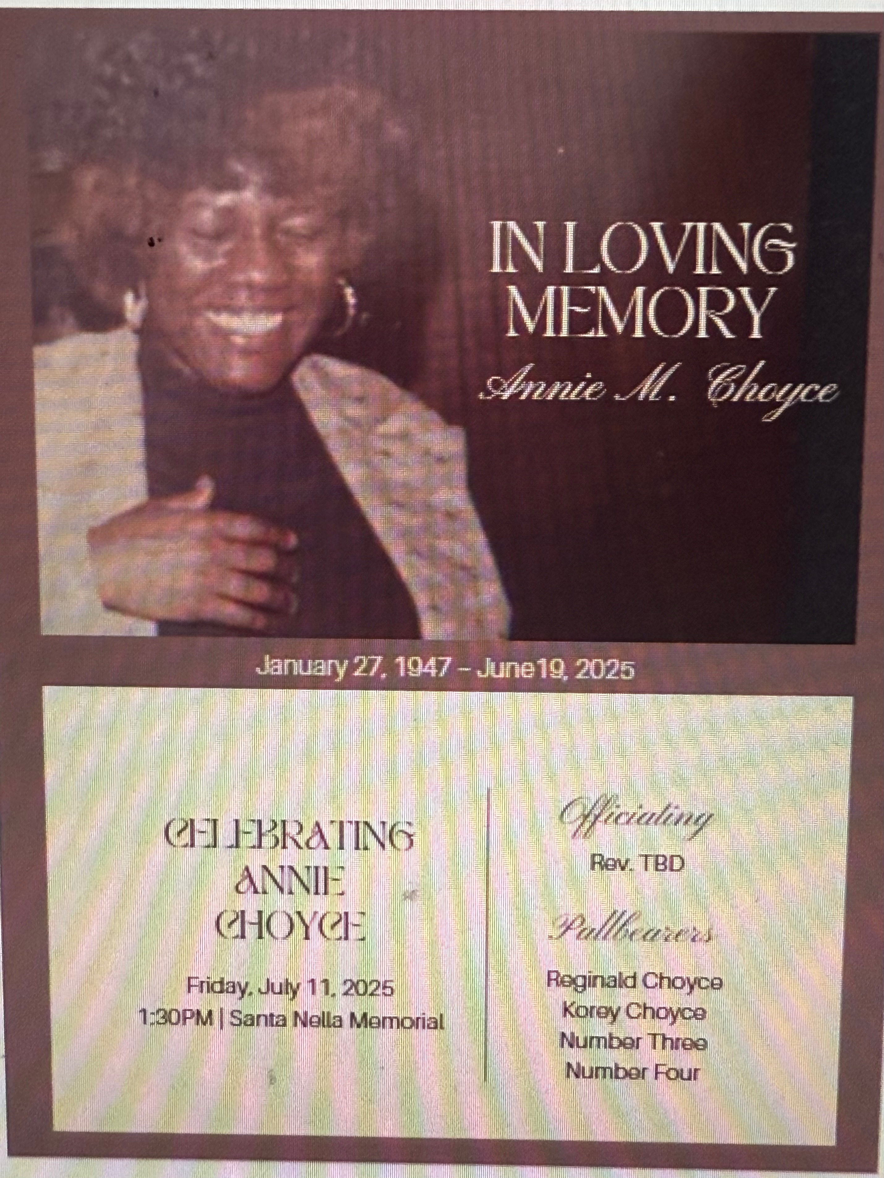 Annie Choyce was a loving mother, wife, grandmother, sister, and friend. She touched the lives of everyone around her. Annie had a special way of making each grandchild feel like they were her favorite, always offering warmth, support, and unconditional love. Her kindness and dedication to her family created a strong foundation that will be remembered for generations.